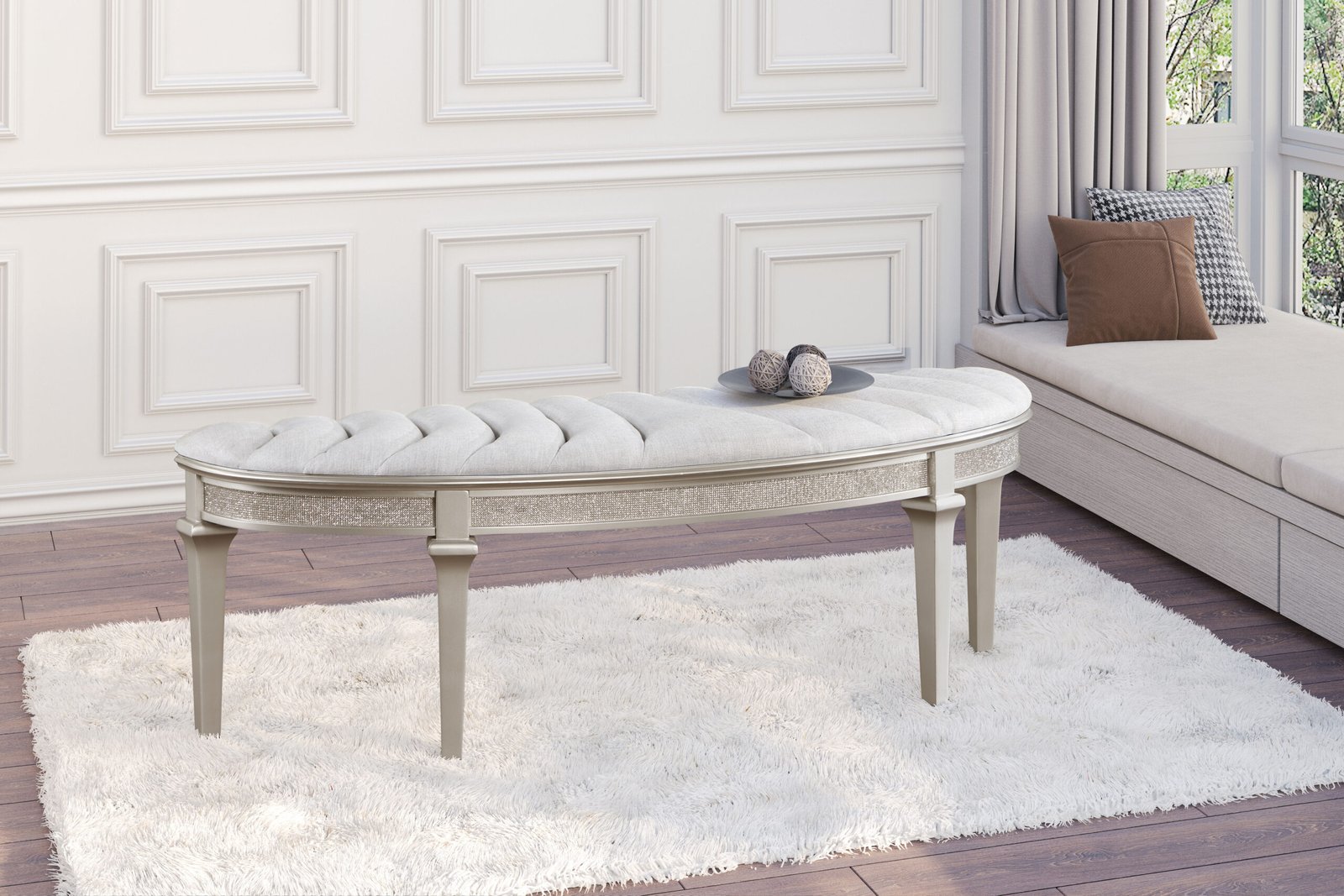 Evangeline Curved Fabric Upholstered Bench Silver Oak