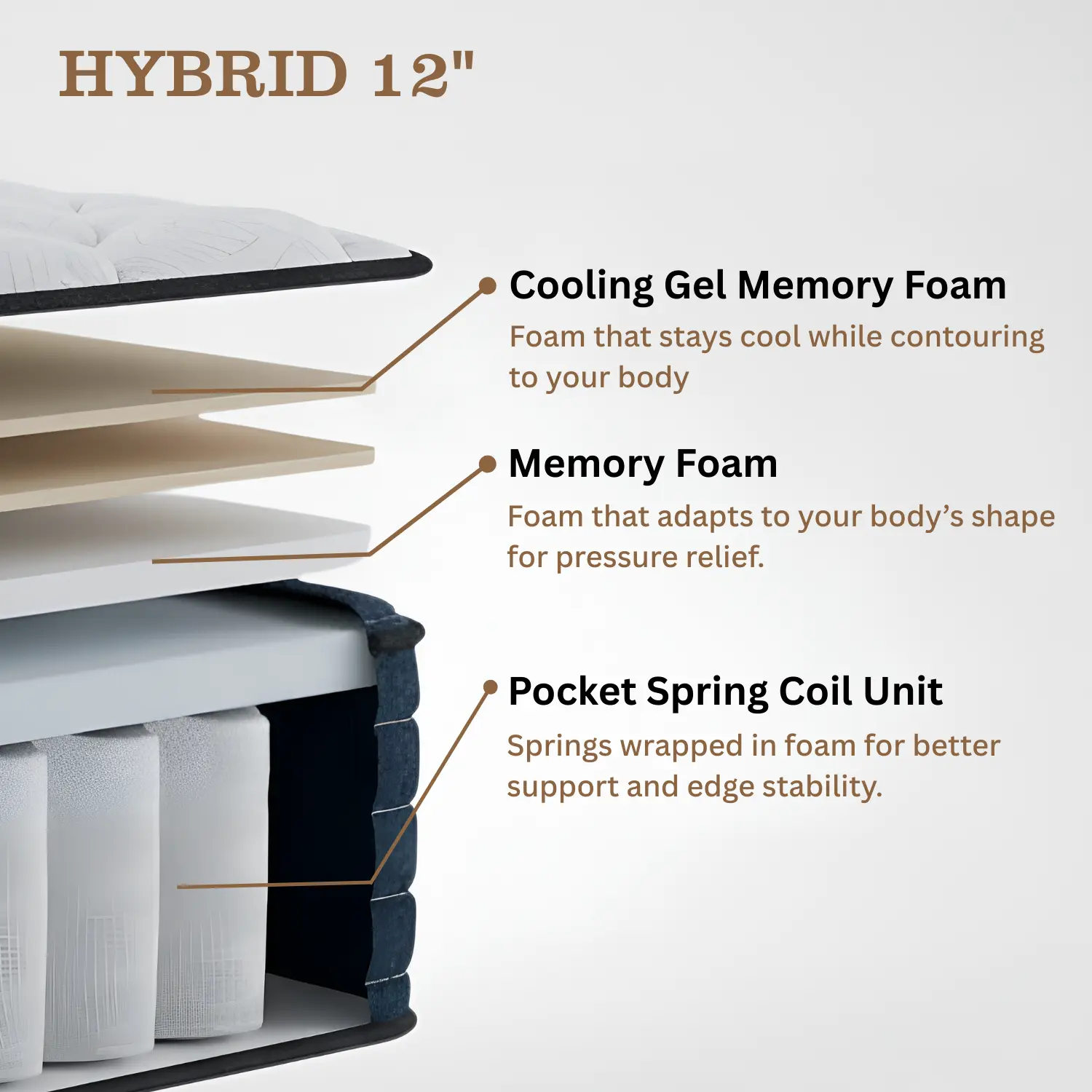 Experience the perfect blend of support and luxury with our 12-Inch Cooling Gel Memory Foam Hybrid Mattress. Engineered for every sleeper, this mattress combines advanced foam technology with a traditional coil feel.