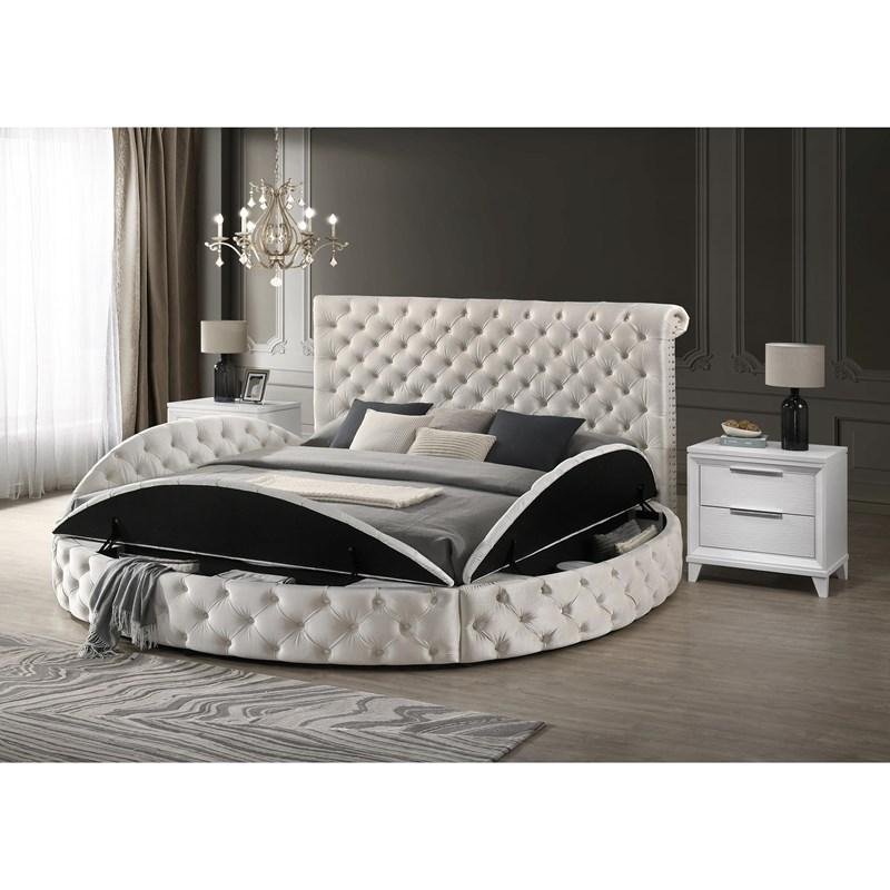 Experience “opulent comfort” and “dramatic sophistication” with the Brigitte Queen Upholstered Storage Bed. This “stately centerpiece” features a pristine ivory finish. It highlights “traditional charm” and “modern luxury” flawlessly. Furthermore, the grand frame showcases plush velvet upholstery with a unique round form. These details offer a “bold statement” and “regal charm” for your “personal retreat.”