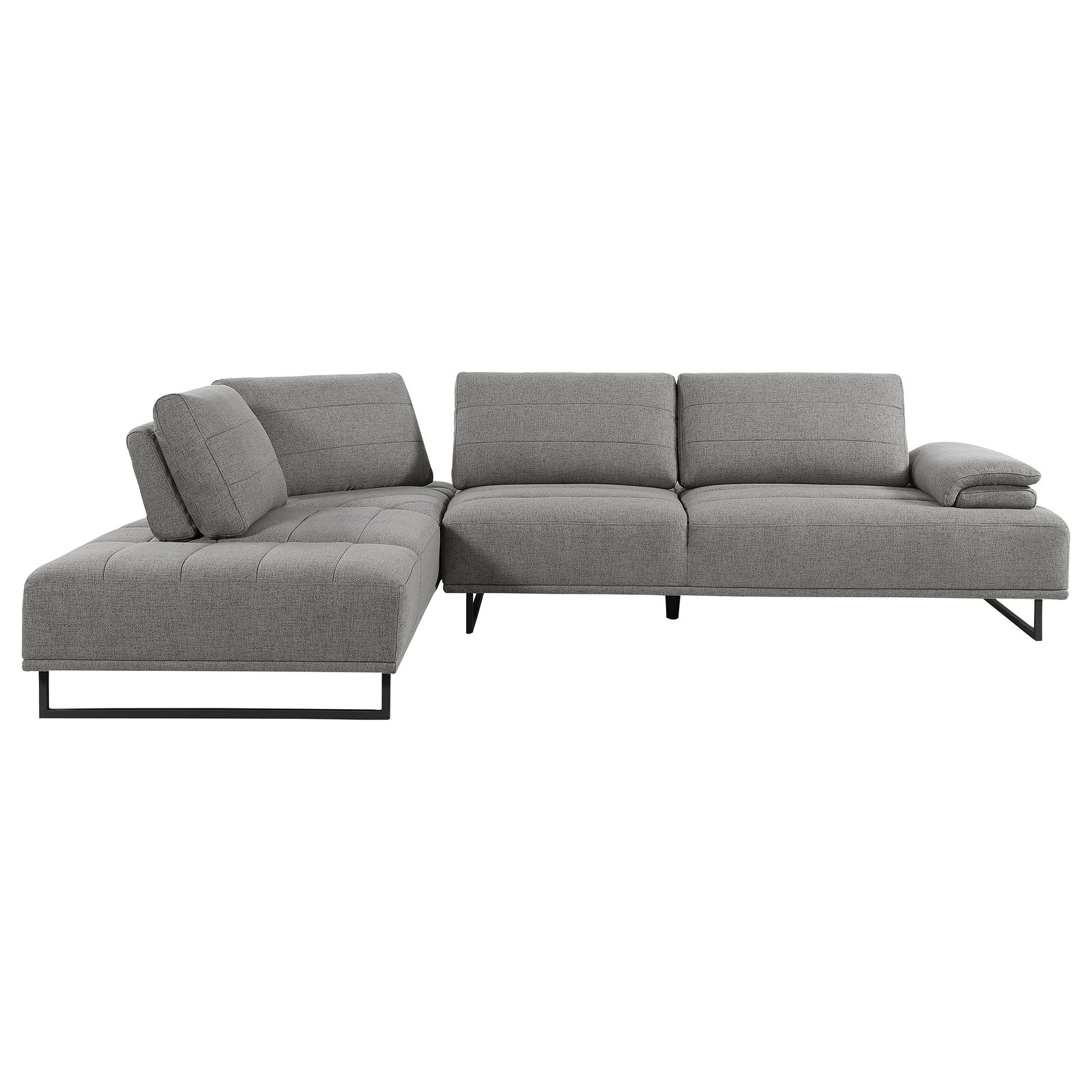 Add modern stylishness to your space with this magnificent contemporary sectional sofa. It is exceptionally upholstered in an elegant taupe woven fabric that’s soft to the touch. The powder coated black base features U-frame legs for sturdiness. One end has an open chaise-like design, while the opposite has an extension pillow top arm that can be used as a headrest when lounging. An added feature is the individual self-adjusting back rests, which allow for shortening and expanding seat depth.