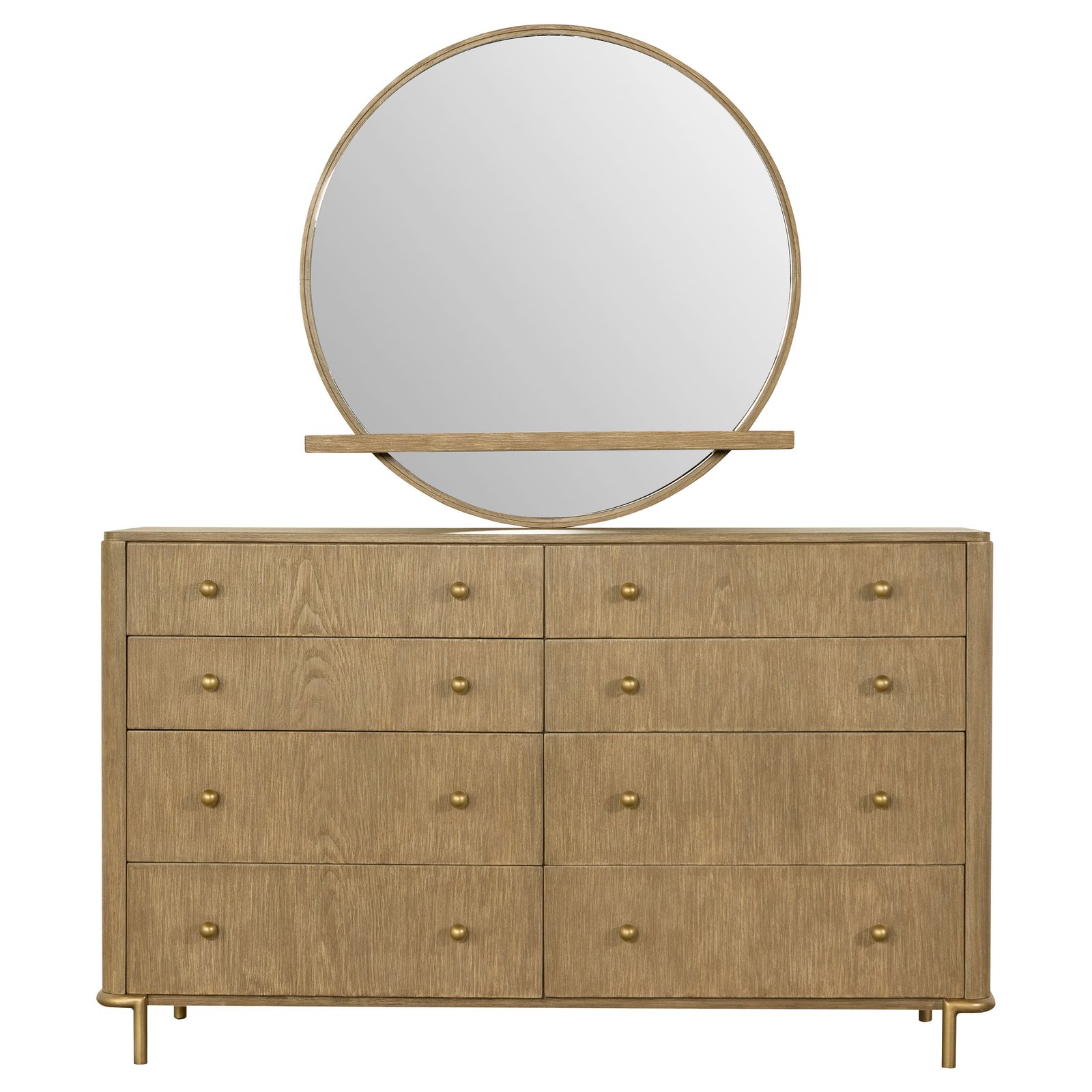 This mid-century modern dresser and mirror set blends elegant design with versatile functionality. The eight-drawer dresser features a wire-brushed sand wash finish, aged brass knobs, and slender metal legs for a refined touch. Felt-lined top drawers offer safe storage for delicate items, while softly rounded corners add subtle sophistication. Above, the round mirror includes a felt-lined tray and can be mounted to the dresser or hung independently on the wall, offering flexible styling and practical beauty for any bedroom.
