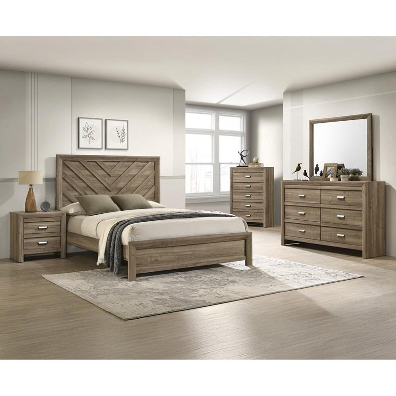 The Valor Full Panel Bed in a warm light brown finish blends rustic charm with modern transitional style, making it a striking centerpiece for any bedroom. Crafted from wood and wood byproducts, this bed features a chevron-patterned headboard that adds texture and visual interest, paired with a low footboard and sturdy rails for reliable support.