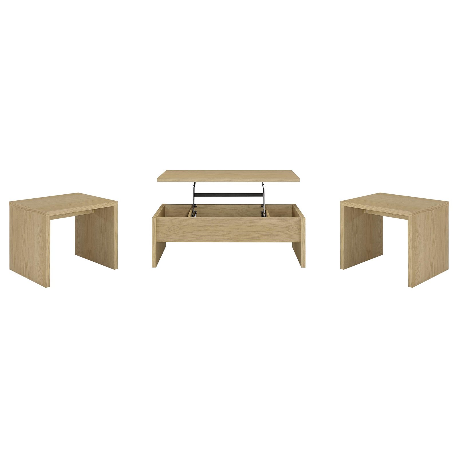 Rooted in clean geometry and modern ease, this coffee table set brings versatile function and understated style to any living space. The lift-top cocktail table offers hidden storage beneath a smooth surface that rises to meet your needs, while the coordinating end table features an open, minimalist form. With crisp lines, durable construction, and a warm woodgrain texture, this set blends casual utility with quiet sophistication for everyday living.