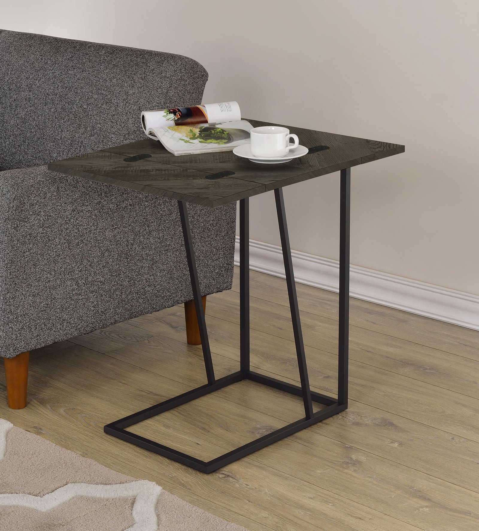 This versatile C-table combines functionality and sleek design, perfect for modern living spaces. Crafted with an engineered wood top featuring a scratch-resistant rustic grey laminate veneer, it offers durability and style. The top folds out, providing expanded surface area when needed. Supported by a sturdy metal base with a sandy black powder coated finish, it blends practicality with elegance. Its slim profile allows it to slide easily under sofas or chairs, making it an ideal space-saving solution.