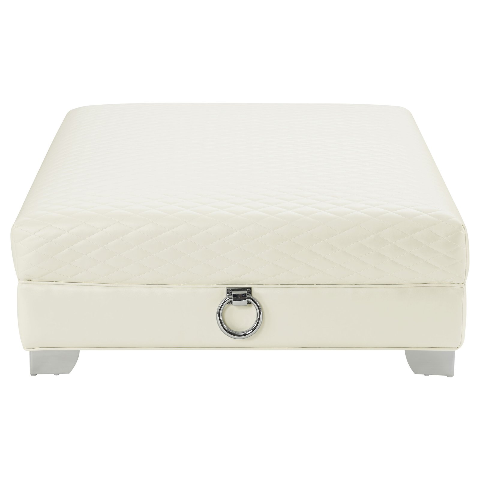 Chic barely begins to describe this decor gem. Styled to impress, this ottoman reflects a cool Art Deco motif. Revisit designs from eras past with a low-profile ottoman wrapped in fresh pearl white leatherette. Quilted detailing joins chrome doorknocker handles and chrome legs for a vibrant accent effect. Make this ottoman part of a stylish retro themed space.