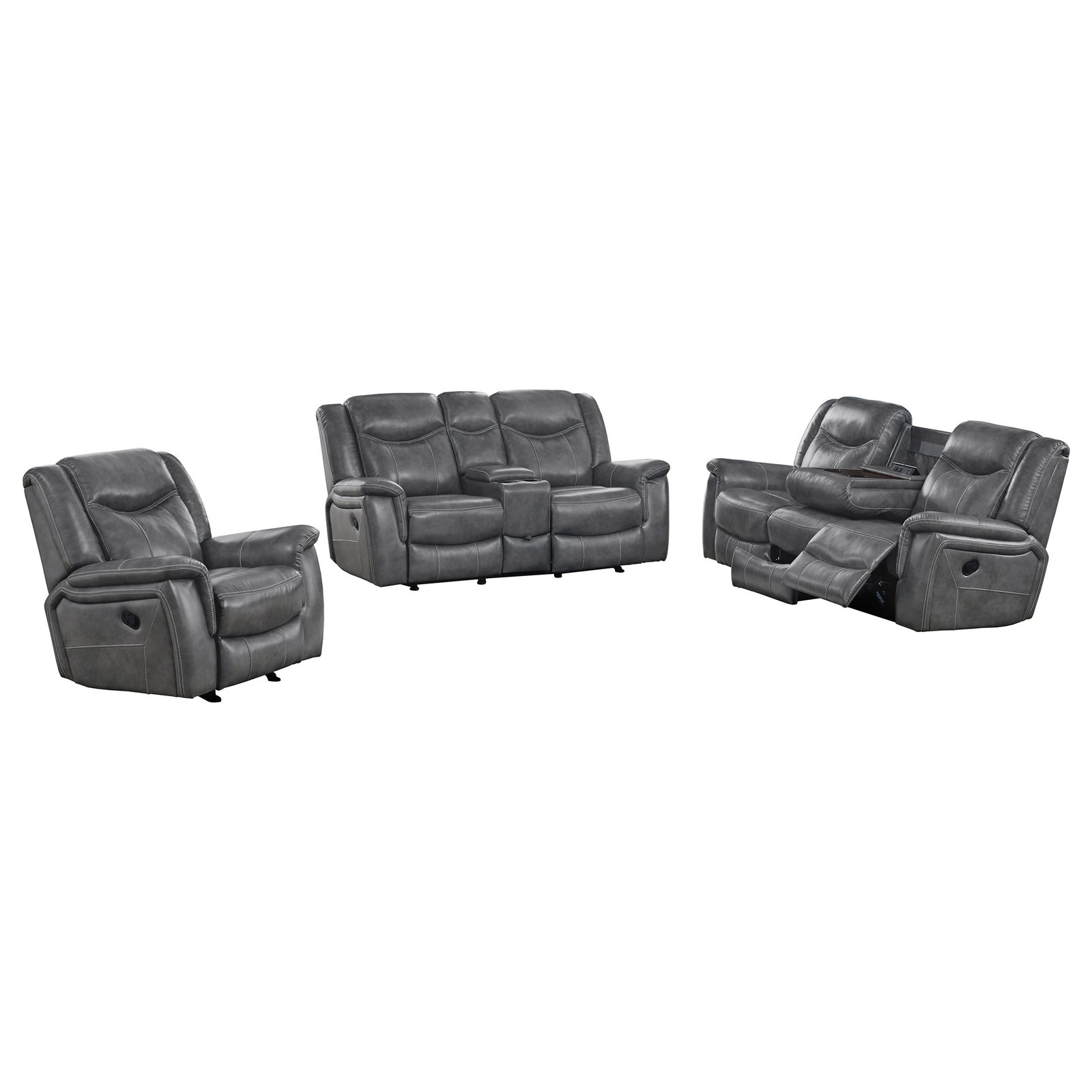 Experience the perfect blend of comfort and functionality with this reclining sofa set, upholstered in smooth grey faux leather for a contemporary appeal. Designed for relaxation, each piece features plush cushioning, padded headrests, and supportive armrests. The collection includes thoughtful upgrades like drop-down tables with cup holders, power outlets, hidden storage, and cool gel memory foam seating. Built with durable metal and plywood framing, this set redefines everyday comfort in modern living spaces.