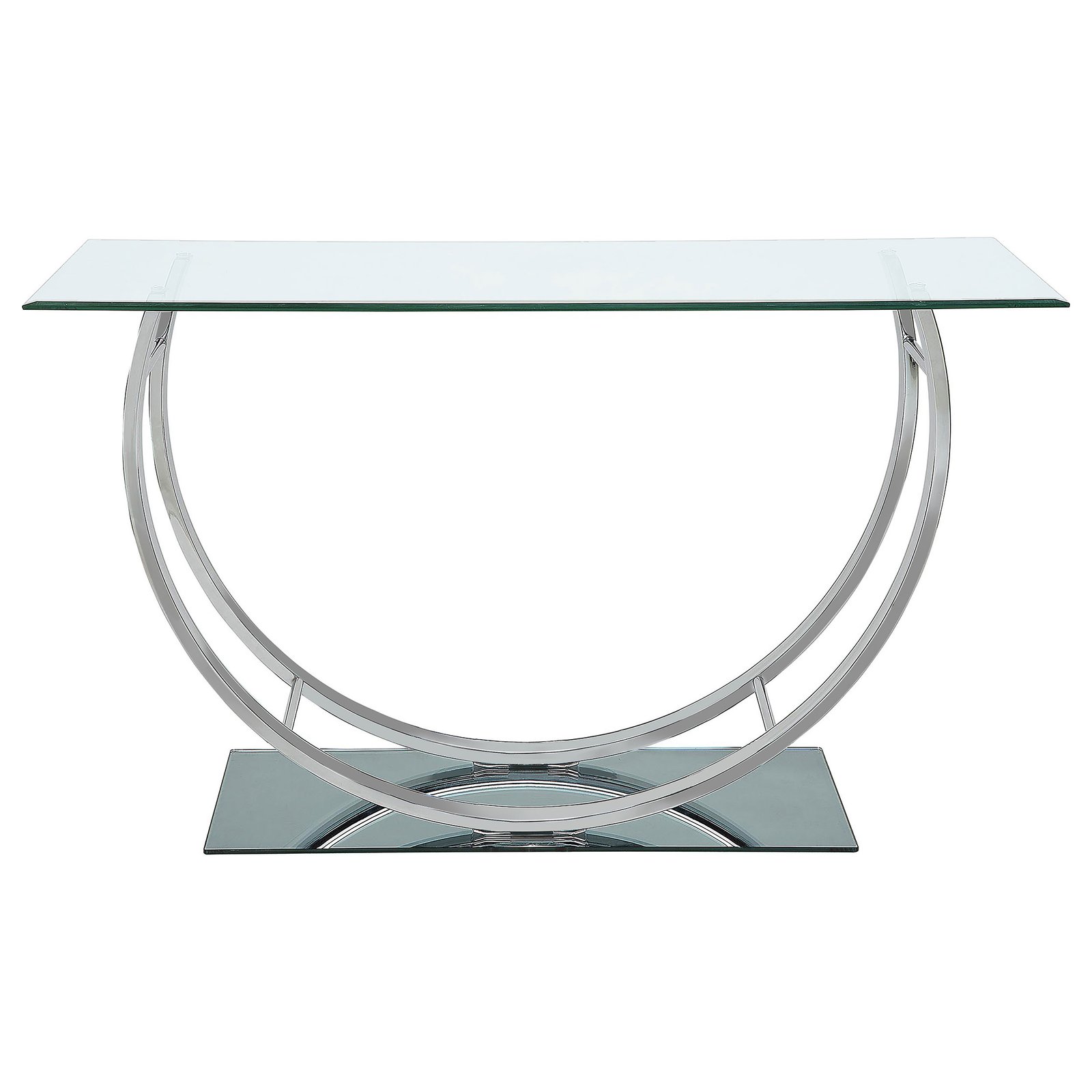This modern rectangular console table showcases a clear tempered glass top paired with a sleek mirrored base, creating a polished, contemporary appeal. The curved frame, crafted from heavy gauge electroplated chrome metal, adds a touch of sophistication and elegance. Built with durable materials, this console table is perfect for entryways, hallways, or behind sofas, offering a striking, functional piece that enhances any modern space while ensuring lasting quality.
