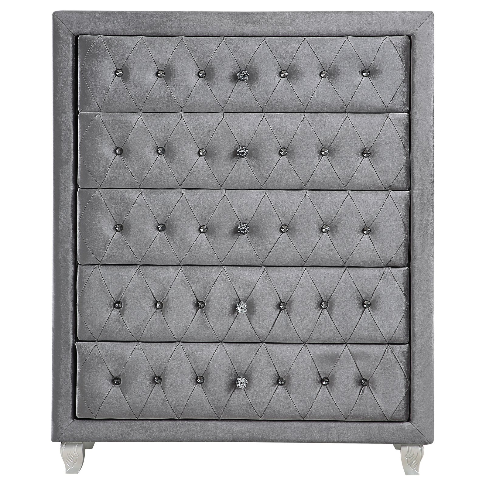 Dress up your space with chic, modern luxury. Exquisitely designed, this stylish chest makes any bedroom look more glamorous. Its front is adorned with trendy button tufting. Its frame is enhanced by a stunning, shining, grey metallic finish. With five large drawers for spacious storage, it’s as practical as it is beautiful.