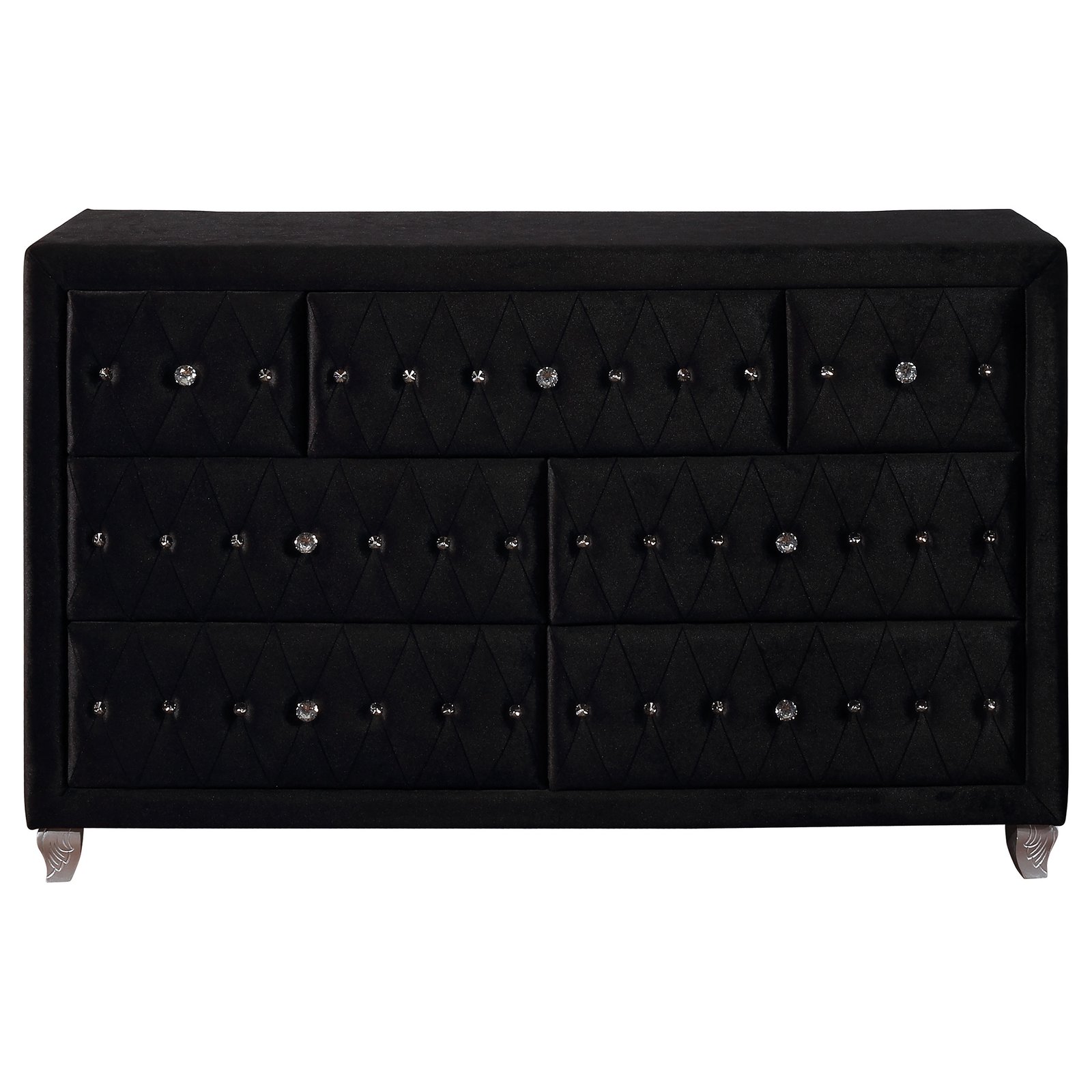 Add modern glamour to a young adult’s bedroom with this seven-drawer black dresser. The ultimate luxury, soft velvet fabric adorns the sleek silhouette. Elevate the level of chic sophistication with radiant, curved legs in a metallic finish. Crystal drawer pulls and lines of crystal button diamond tufting adorn the drawers. Top with a mirrored vase full of fresh flowers or the latest magazines to complete the stylish look.