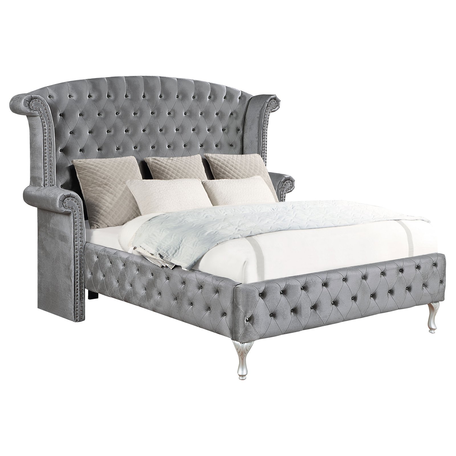 This magnificent California king bed creates a breathtaking focal point in a master en suite. Covered in lovely, grey fabric, its frame exudes tasteful glamour. Stylish button tufting adorns its base and headboard, giving it a luxurious look. Its dainty, curved legs boast a beautiful, silvery finish for an added touch of polish. The chic, curved design of its headboard is accentuated by intriguing, metallic trim, completing its stunning design.