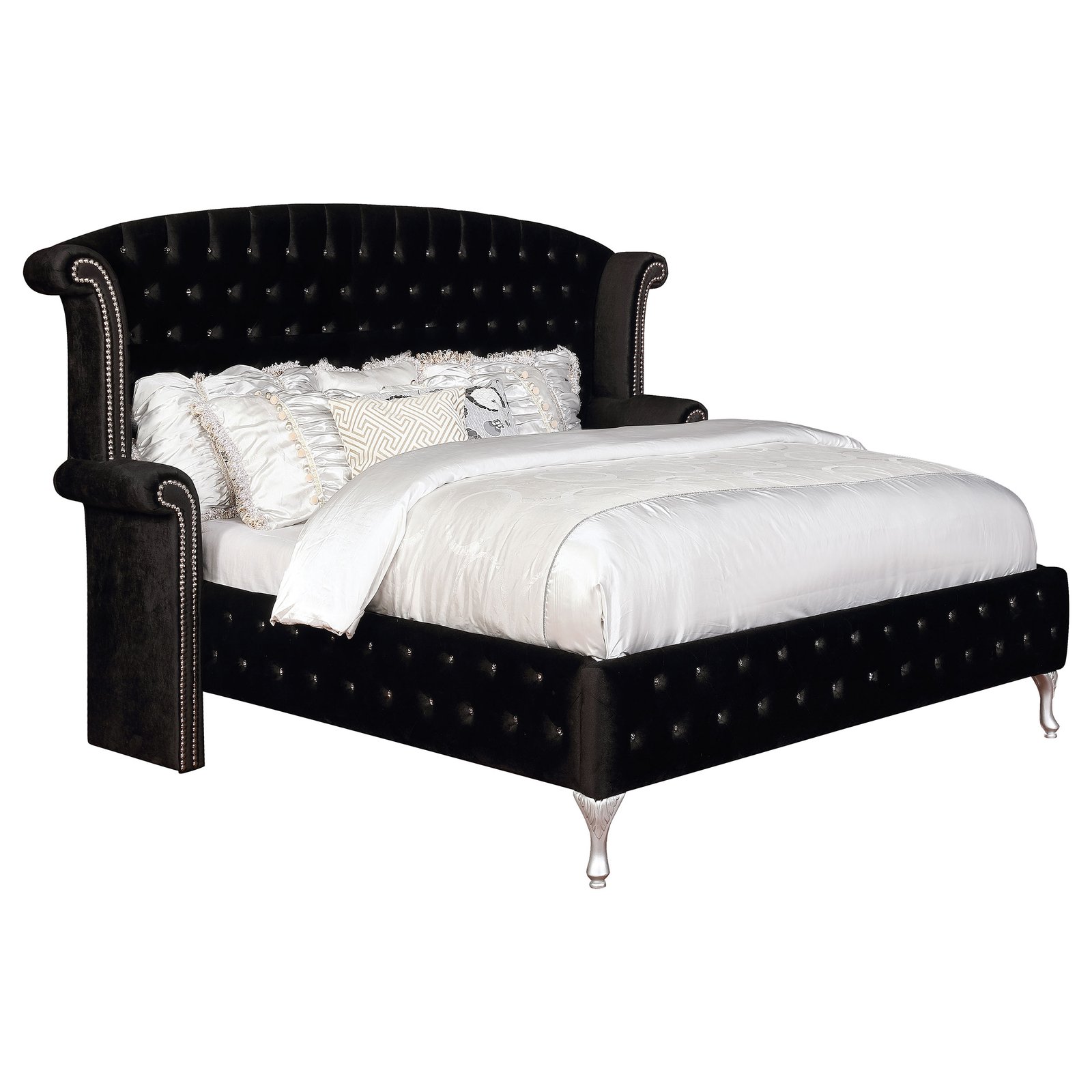 Dress up a bedroom with luxurious glamour. This magnificent queen bed has a truly elegant look. Its tall, stately headboard boasts bold, metallic trim. Beautiful button tufting adorns its frame, giving it a chic, sophisticated aesthetic. Complete with gorgeous black upholstery, this bed makes a stunning statement of style.