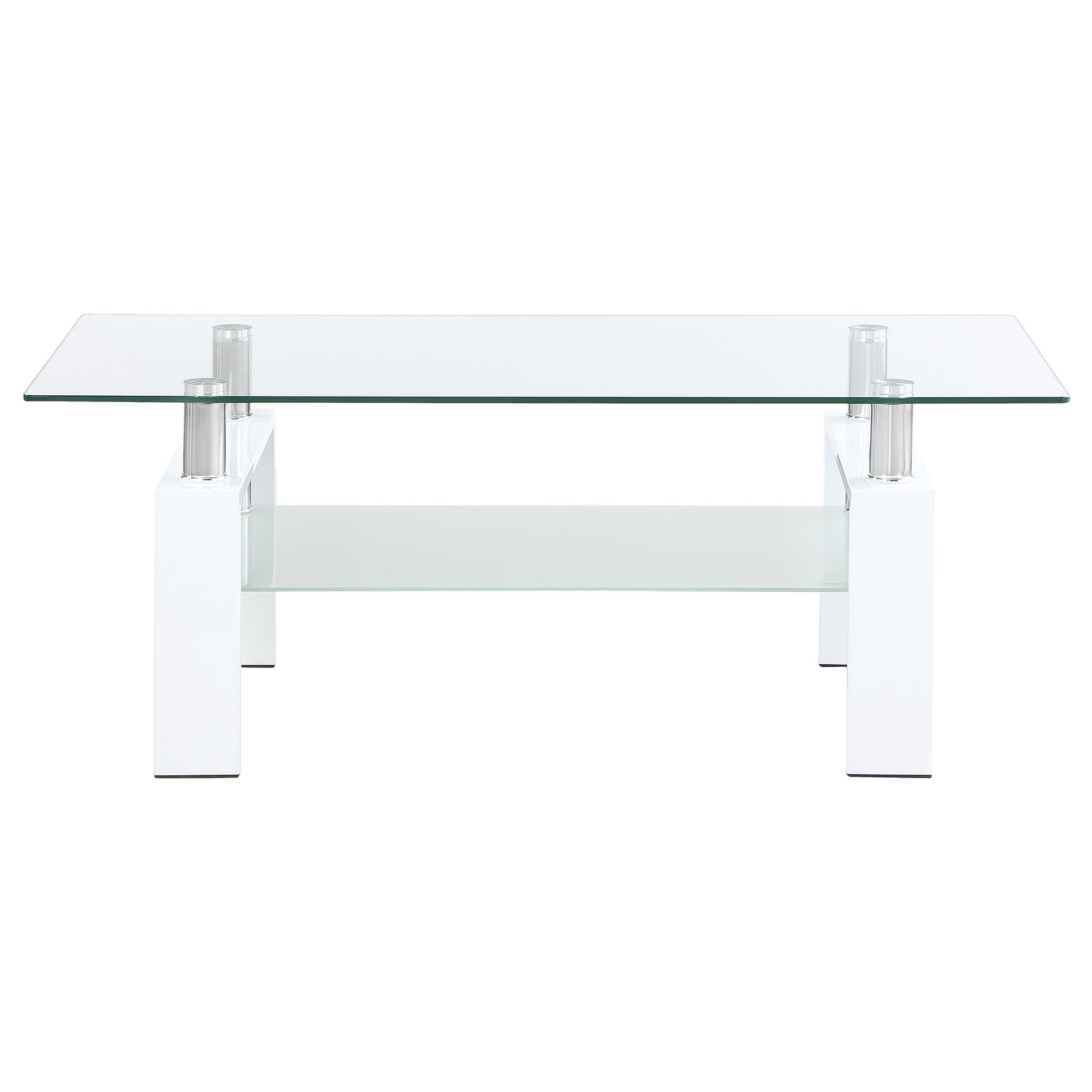 Enhance your living room with this sleek rectangular cocktail table, designed for style and functionality. It features a clear tempered glass top, complemented by a frosted tempered glass lower shelf for added storage or display. Supported by a sturdy metal frame, this coffee table combines durability with a modern aesthetic. Perfect for creating an open and airy look in your space, this table seamlessly blends contemporary design with practical utility.