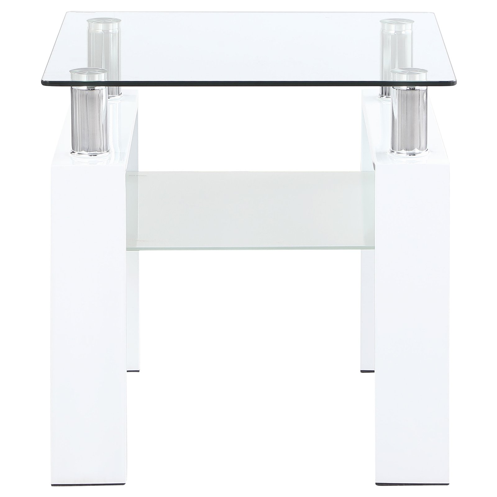This square end table features a clear tempered glass top, complemented by a frosted tempered glass shelf for added storage or display. Supported by a sturdy metal frame, this piece combines both form and function. Its sleek design offers a modern look that suits a variety of contemporary living spaces. Whether used for storage or as an accent, this end table seamlessly blends with your home decor while providing a clean, open aesthetic.
