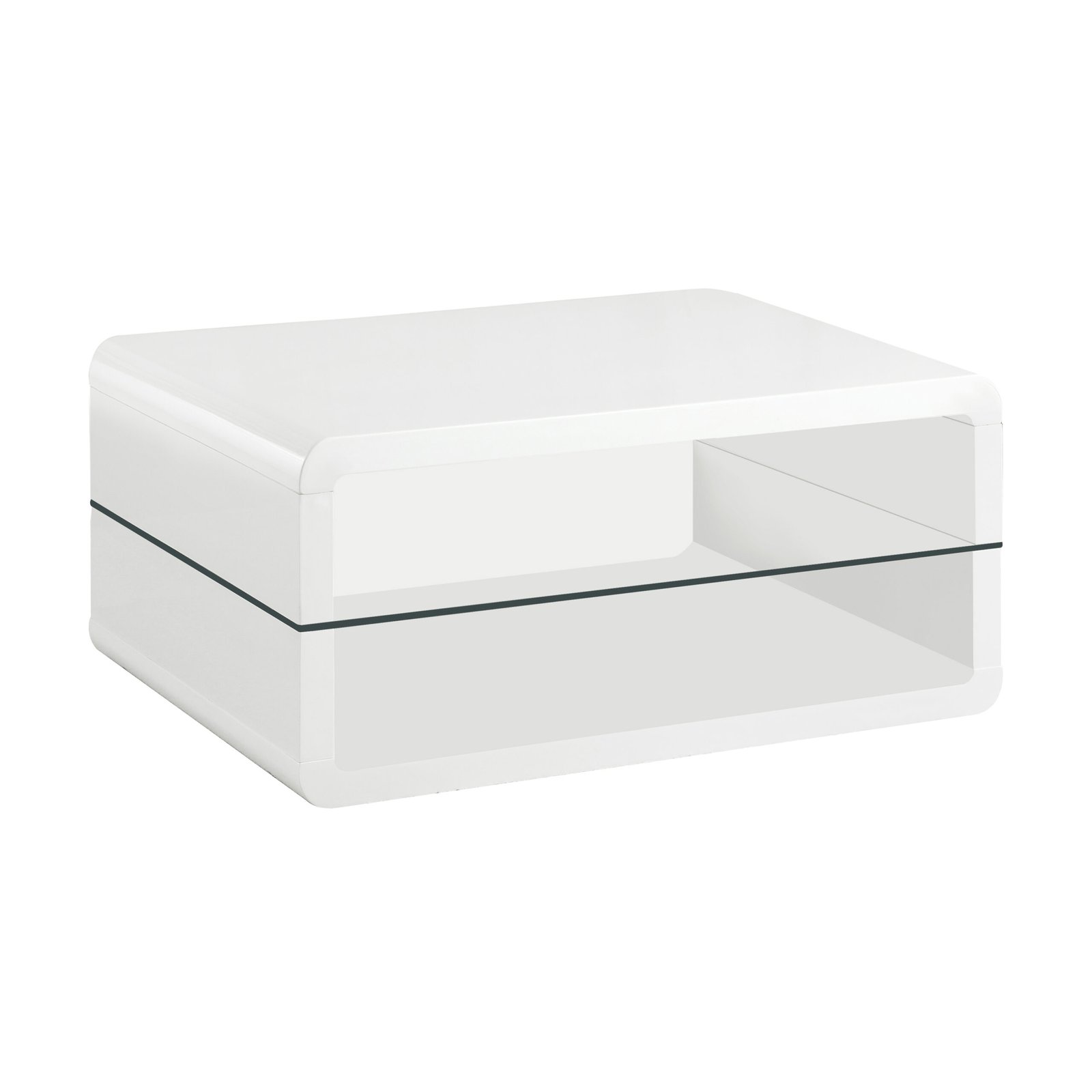 This ultra-modern rectangular coffee table combines a sleek white high-gloss finish with the sophistication of clear tempered glass. Crafted from engineered wood, its smooth, curved edges add a contemporary appeal, while the integrated glass shelf provides functional storage or display space. This piece seamlessly blends durability and modern aesthetics, making it a standout centerpiece for any living room setting.