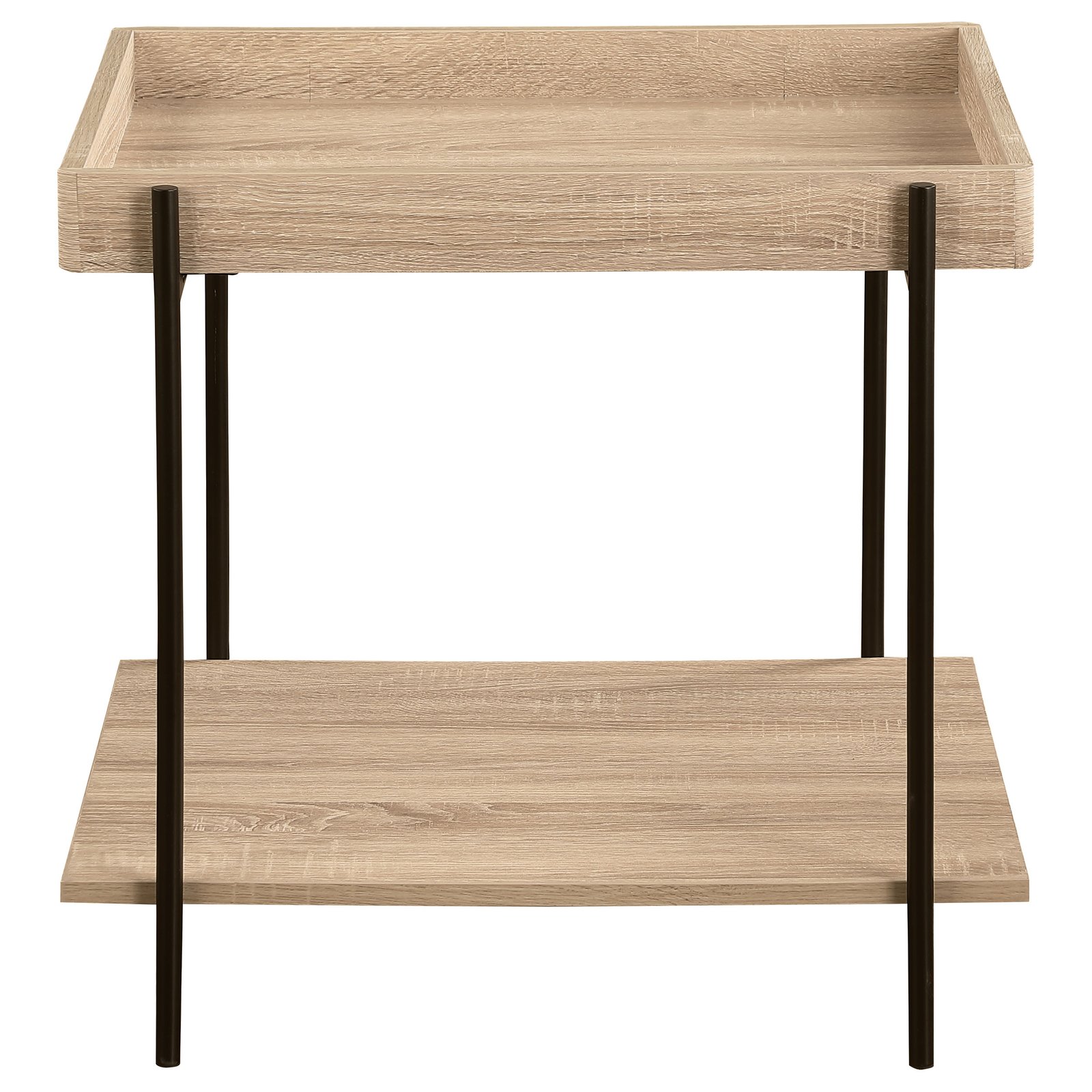 Infuse your space with the contemporary casual vibes of a modern end table, constructed from metal and engineered wood. This charming choice offers a tray-like table top that creates a sense of depth and dimension, perfect for refreshments or a decorative display. Its natural wood-like features are highlighted by a light brown wood grain finish, clean and timeless, lending itself well to a variety of spaces and surrounding decor choices. The side table features a slim, black finish metal frame that creates structure, enhancing its modern appeal. It includes a full lower shelf, providing convenient storage or display space for books or personal items.