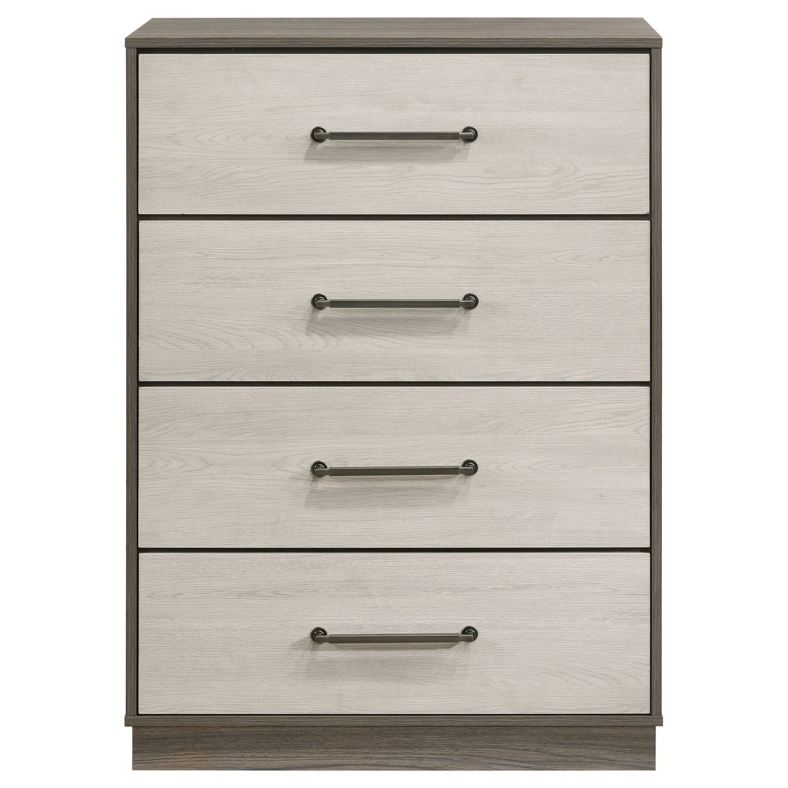 Enhance your bedroom with the elegant functionality of this four-drawer chest, designed to offer ample storage space while adding a touch of contemporary style. The sleek two-tone melamine finish blends natural wood tones, creating a modern aesthetic that complements any decor. Each drawer features smooth metal extension glides and antique nickel handles, ensuring easy access and a touch of vintage charm. The floating base design provides stability and a chic appearance, making this chest both practical and stylish. Crafted from durable melamine, particle board, and MDF, this chest is built to last, offering both beauty and functionality to your home.
