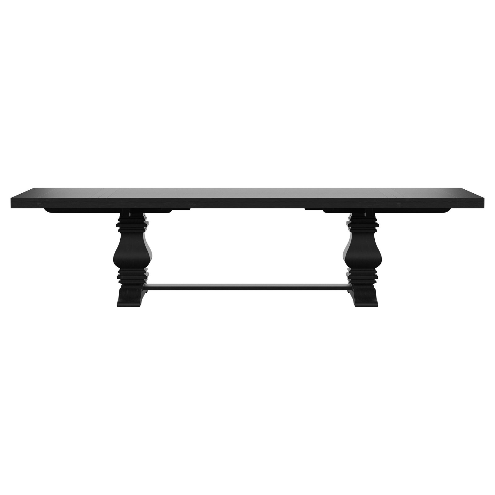 Transform your dining space with the perfect blend of timeless elegance and modern comfort. This dining set showcases a stately rectangular table with a double pedestal trestle base, evoking romantic charm and artisanal craftsmanship. The antique black finish lends a dramatic, yet versatile touch to any dining room. Paired with beautifully tufted dining chairs, the set brings a soft, inviting aesthetic, with plush cushioning and a graceful wingback silhouette. Designed for hosting family dinners or special gatherings, the table expands easily with a removable leaf, ensuring ample space for cherished guests. This dining set combines refined detail and functional versatility, creating a warm and welcoming space for every meal.