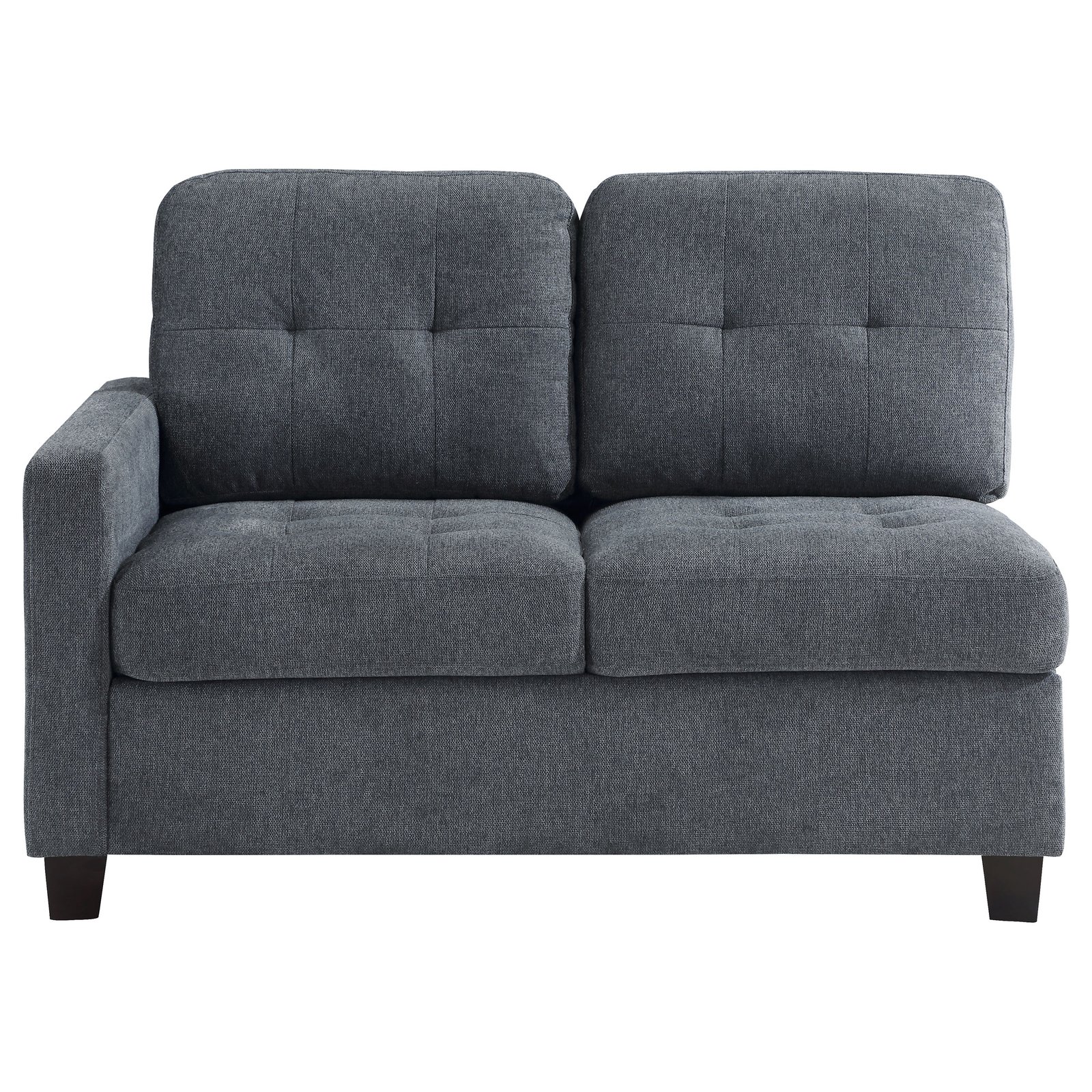 Enhance your sectional with this left arm facing (LAF) loveseat, a key component in creating a comfortable and stylish seating arrangement. The loveseat features elegant fabric upholstery that complements a range of decor styles, making it a versatile choice for your living space. Foam-padded seat cushions offer a luxurious seating experience, while the sturdy wood frame provides reliable support. The left armrest design allows for flexible configuration within your sectional, and the chair’s subtle tufting and chunky wood feet add to its classic appeal. Perfect for expanding your seating options with both style and comfort.