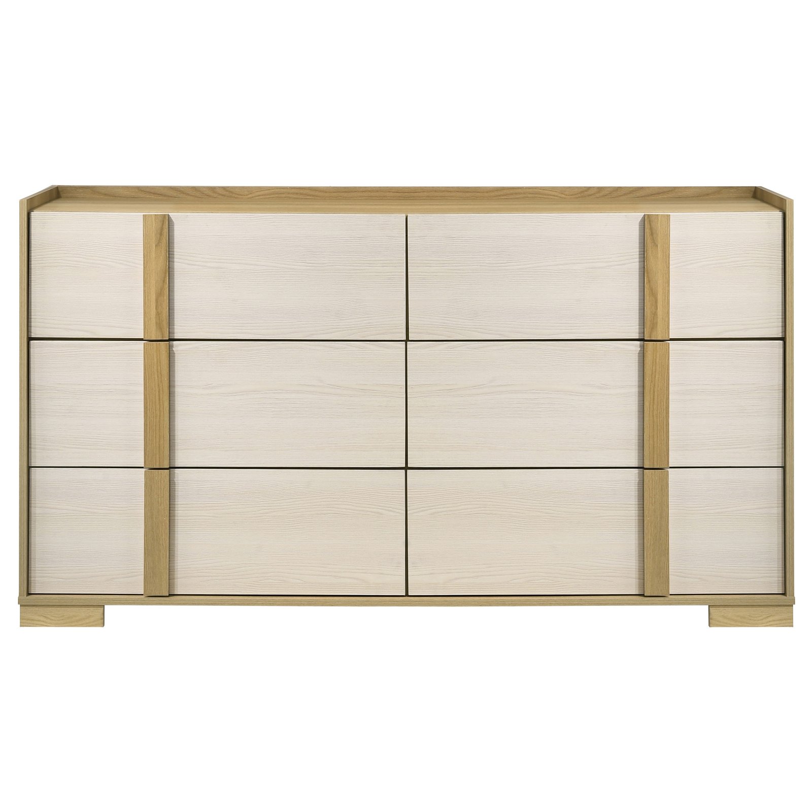 Enhance your bedroom with the contemporary elegance of this six-drawer dresser. Inspired by modern Italian design, it features a sophisticated blend of natural wood tones and white panels crafted from durable, easy-care melamine. The drawers, equipped with metal extension glides and pin-construction joinery, offer smooth operation and ample storage for your clothing and accessories. The vertical lines of the natural finish hardware add a touch of sleek sophistication, perfectly complementing the dresser’s clean lines and modern aesthetic. This dresser is not just a storage solution but a stylish focal point that elevates your home decor.