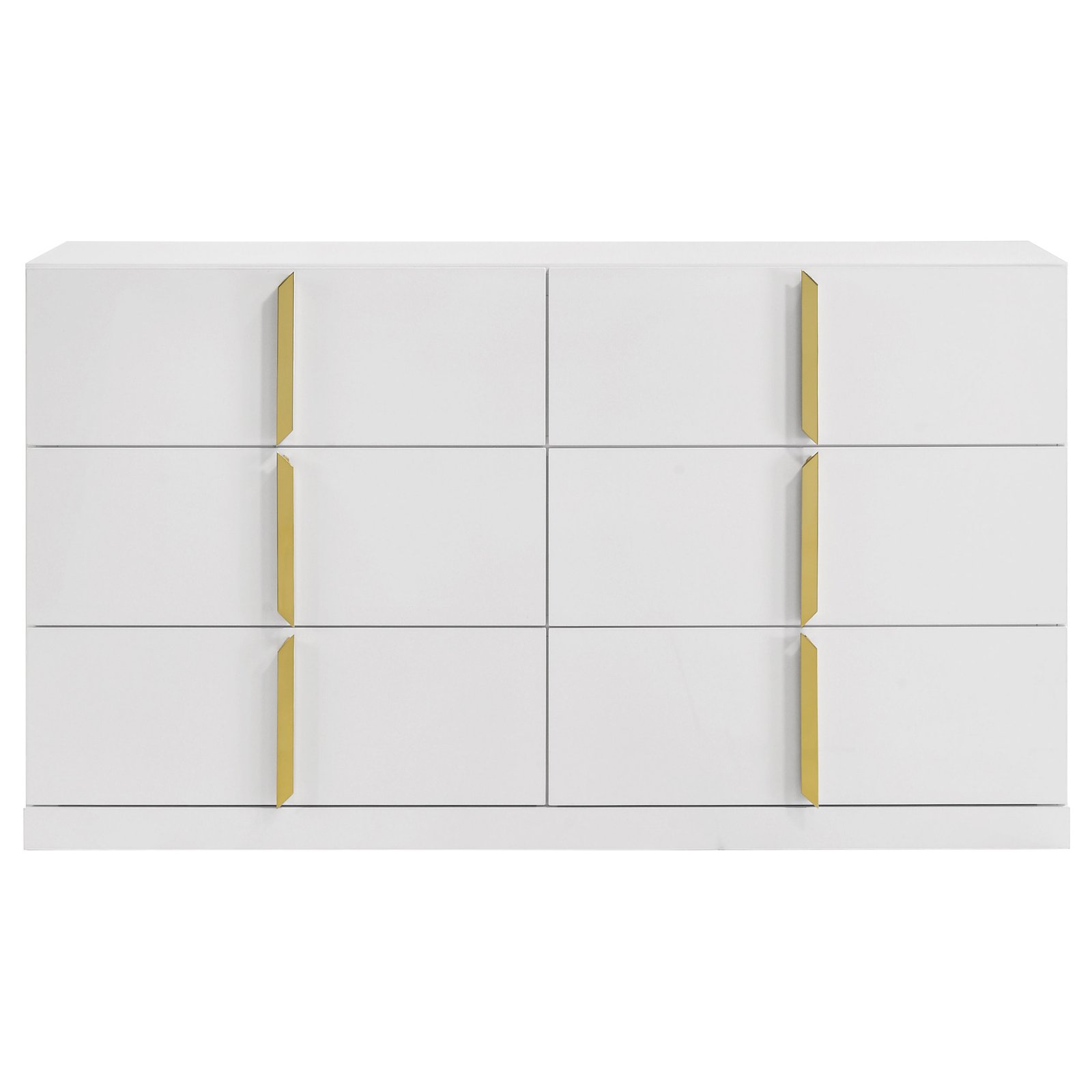 Clean and structured, this six-drawer dresser draws from Italian contemporary style to deliver bold presence and refined function. Finished in white high gloss PET thermoplastic, it offers a scratch-resistant, moisture-resistant surface that is both durable and eco-friendly. Vertically mounted polished gold pulls create a sculptural centerline across six smooth-gliding drawers, combining sleek storage with standout design.