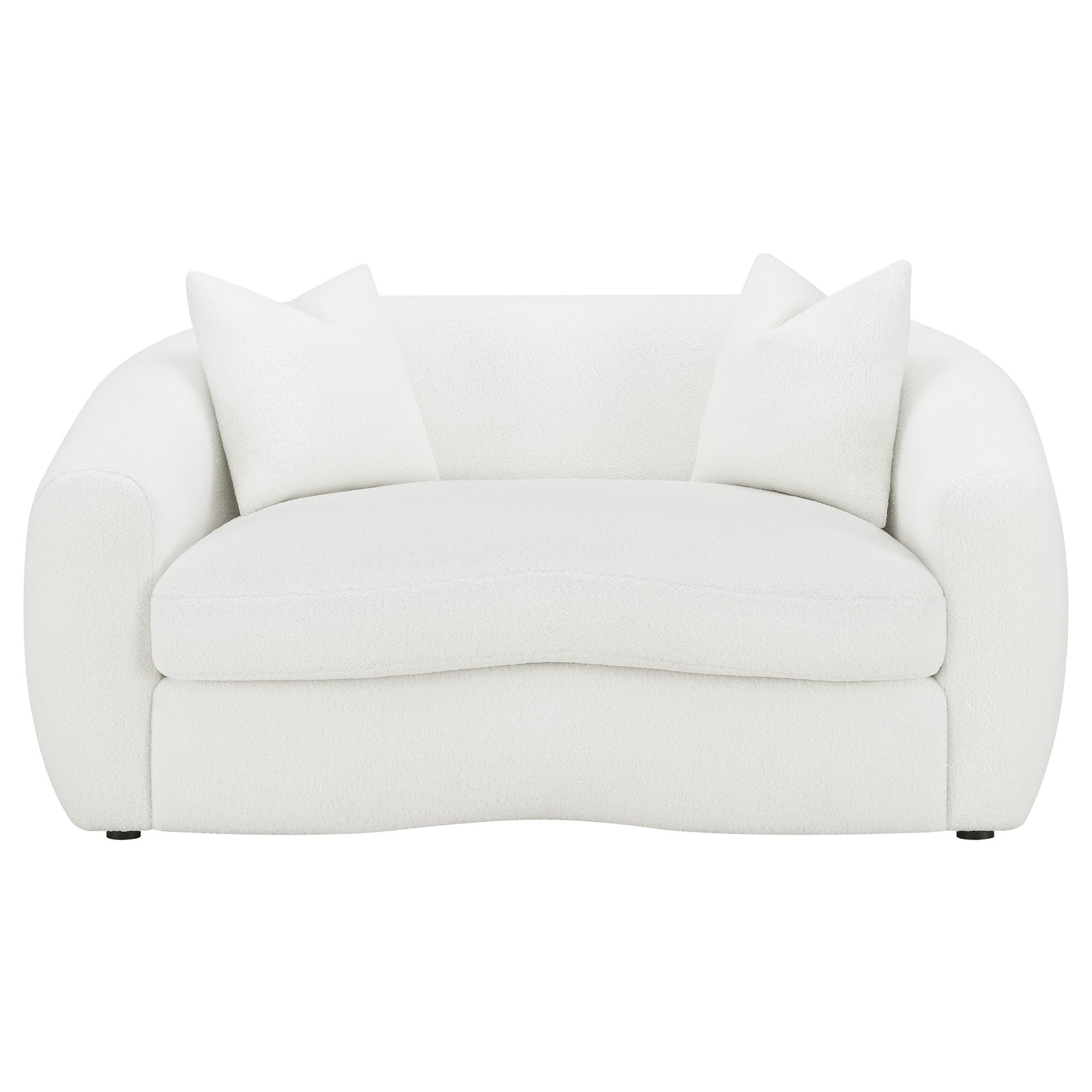 Invite cozy sophistication into your home with this elegantly contoured loveseat, upholstered in soft faux sheepskin boucle fabric. Its curved silhouette and sloped armrests create a smooth, cloud-like form that exudes modern charm. A single plush seat cushion offers comfortable support, while matching faux down-filled accent pillows add refined warmth. Supported by black legs for a hint of contrast, this loveseat blends contemporary elegance with inviting texture, perfect for modern and transitional interiors.