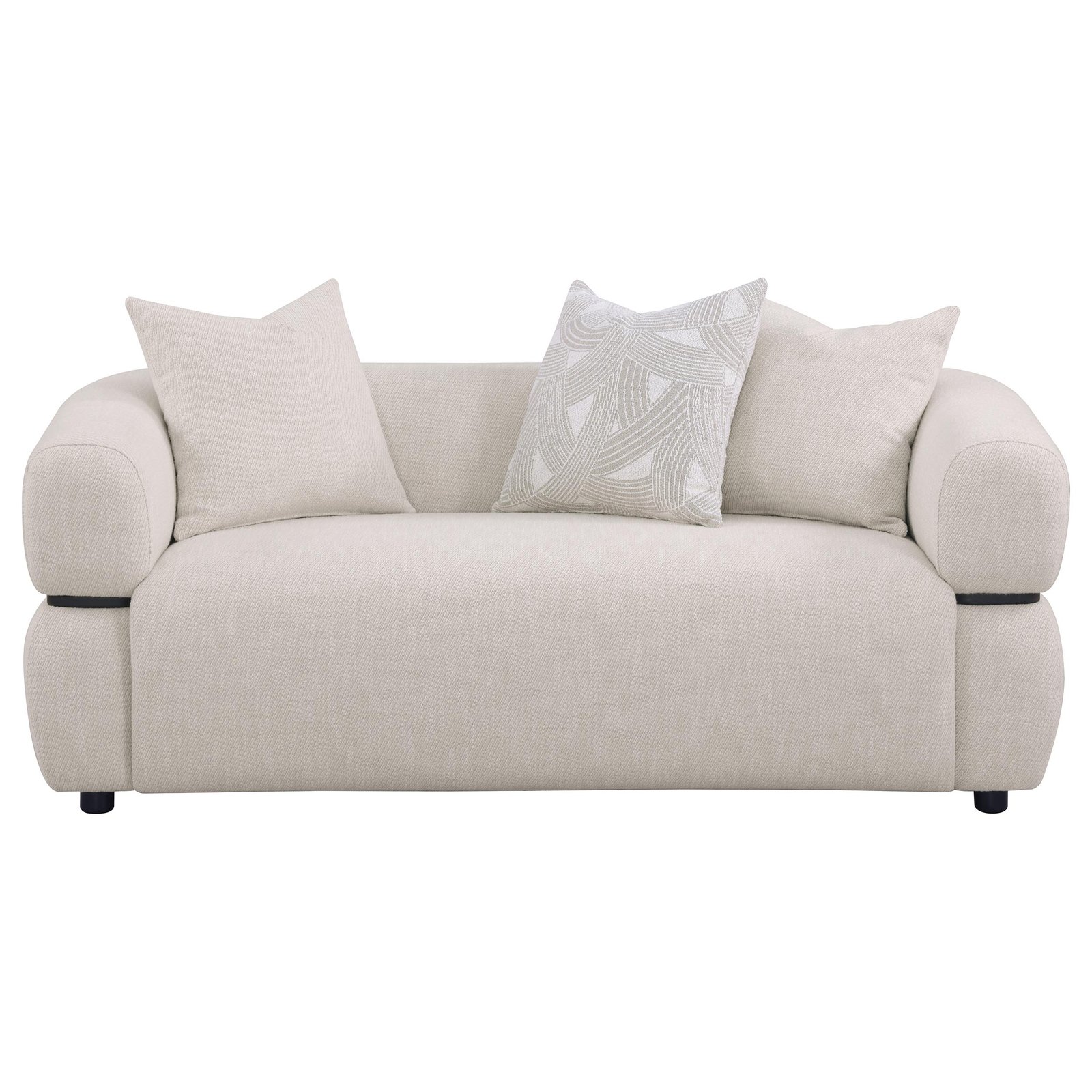 With a striking silhouette and artistic presence, this sculptural loveseat pairs bold form with inviting comfort. A distinctive solid wood waistband traces the frame, emphasizing its contemporary curve. Textured beige upholstery wraps the waterfall bench seat in a tailored embrace, punctuated by plush textured accent pillows. Constructed with pocket coil support for durability, this loveseat becomes an eclectic focal point in modern living spaces.
