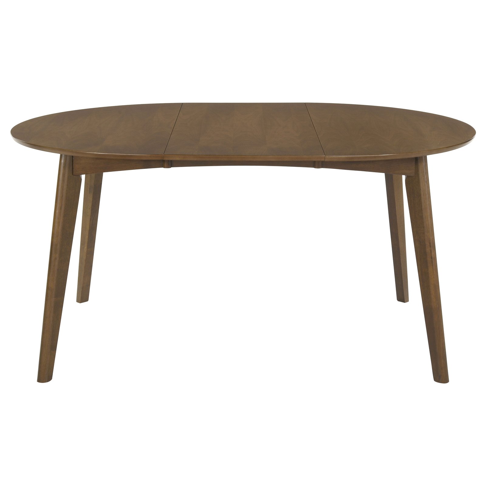The Malone Collection includes this extendable modern dining table. Solid wood construction and angled legs allow for durability against daily use. Removable leaf extends for an oval shape that welcomes a close-knit gathering. Finished in dark walnut for a condo in the city or a log cabin in the mountains. Pull up a chair with cushioned seating and enjoy a home-cooked meal.