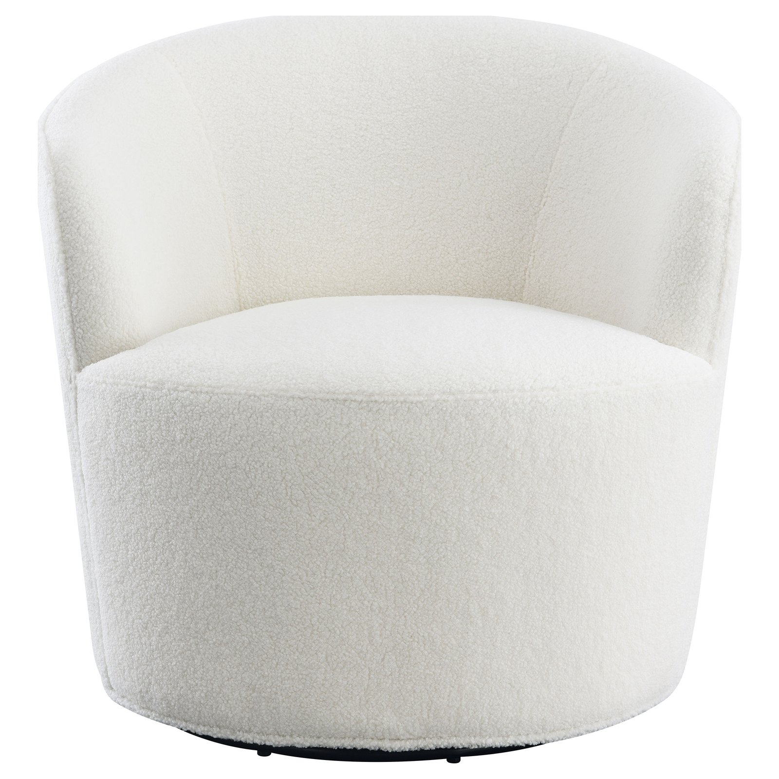 Compact in silhouette but overflowing with style, this contemporary accent chair is a perfect choice for a bedroom or living room sitting area. Its rounded, barrel-inspired silhouette swivels for 360-degree seating perfect for multi-functional spaces. The tight back and seat are upholstered in bright white faux sheep skin that adds soft texture and dimension with an earthy, modern twist. Foam cushioning assure maximum comfort, with webbing support for a firm feel. Perfect for lounging during a video call or catching up with friends and family.