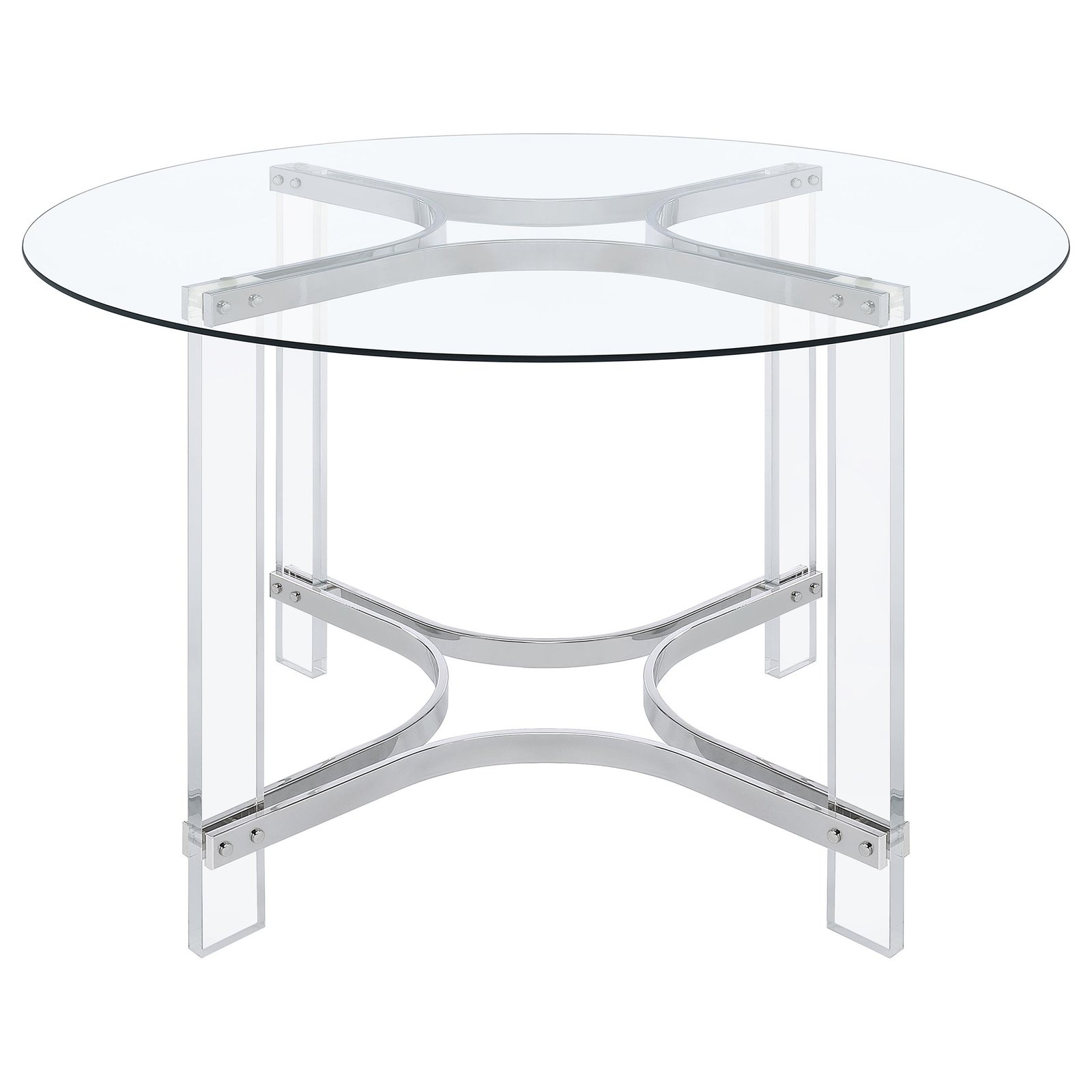 Elevate your dining experience with this chic, contemporary dining set, where modern design meets airy elegance. This set includes a stunning round glass-top table with clear acrylic legs that create a sleek, sculptural profile, complemented by gleaming chrome accents for a touch of sophistication. Four side chairs with clear acrylic seats and backs complete the set, adding a minimalist yet comfortable touch to your space. The sled-inspired chrome bases of the chairs provide stability and a dynamic contrast to the graceful curves of the acrylic, making this set an eye-catching centerpiece for any modern dining room or breakfast nook. Perfectly suited for compact spaces, this set combines style and functionality, offering a light and open feel that effortlessly enhances any decor.