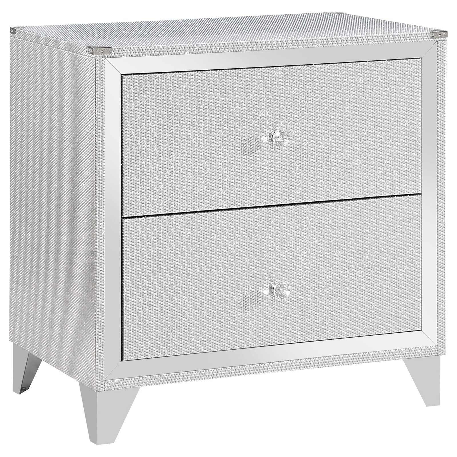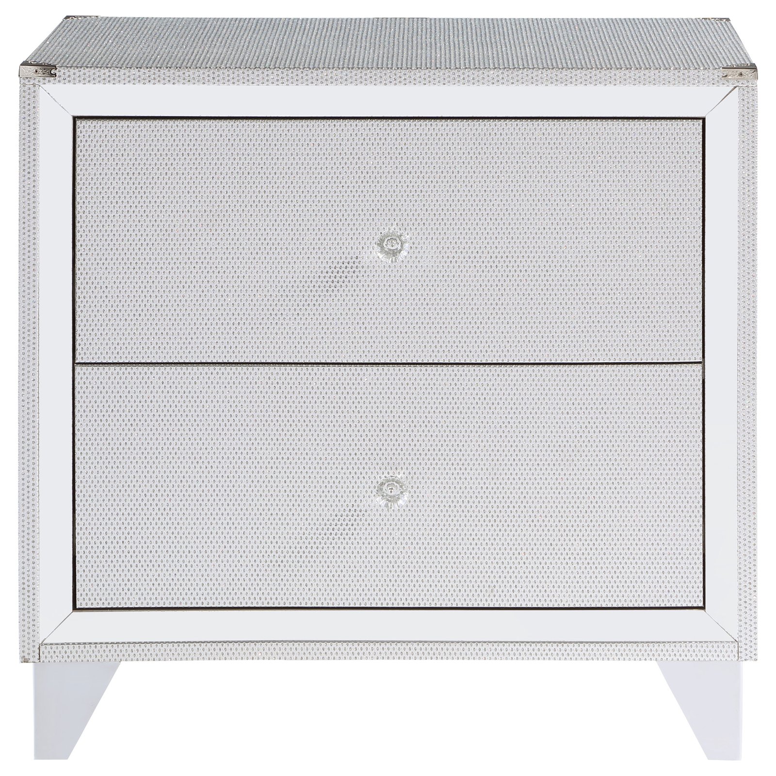 Elevate your suite with the addition of our luxurious 2-drawer nightstand. This exquisite piece features glimmering accents, mirror trim, and acrylic crystal ball pulls, creating a glamorous and sophisticated look. Beyond its stunning aesthetics, this nightstand also offers functionality with its two spacious drawers. Add a touch of opulence to your bedroom with this beautiful and functional nightstand, combining style and practicality effortlessly.
