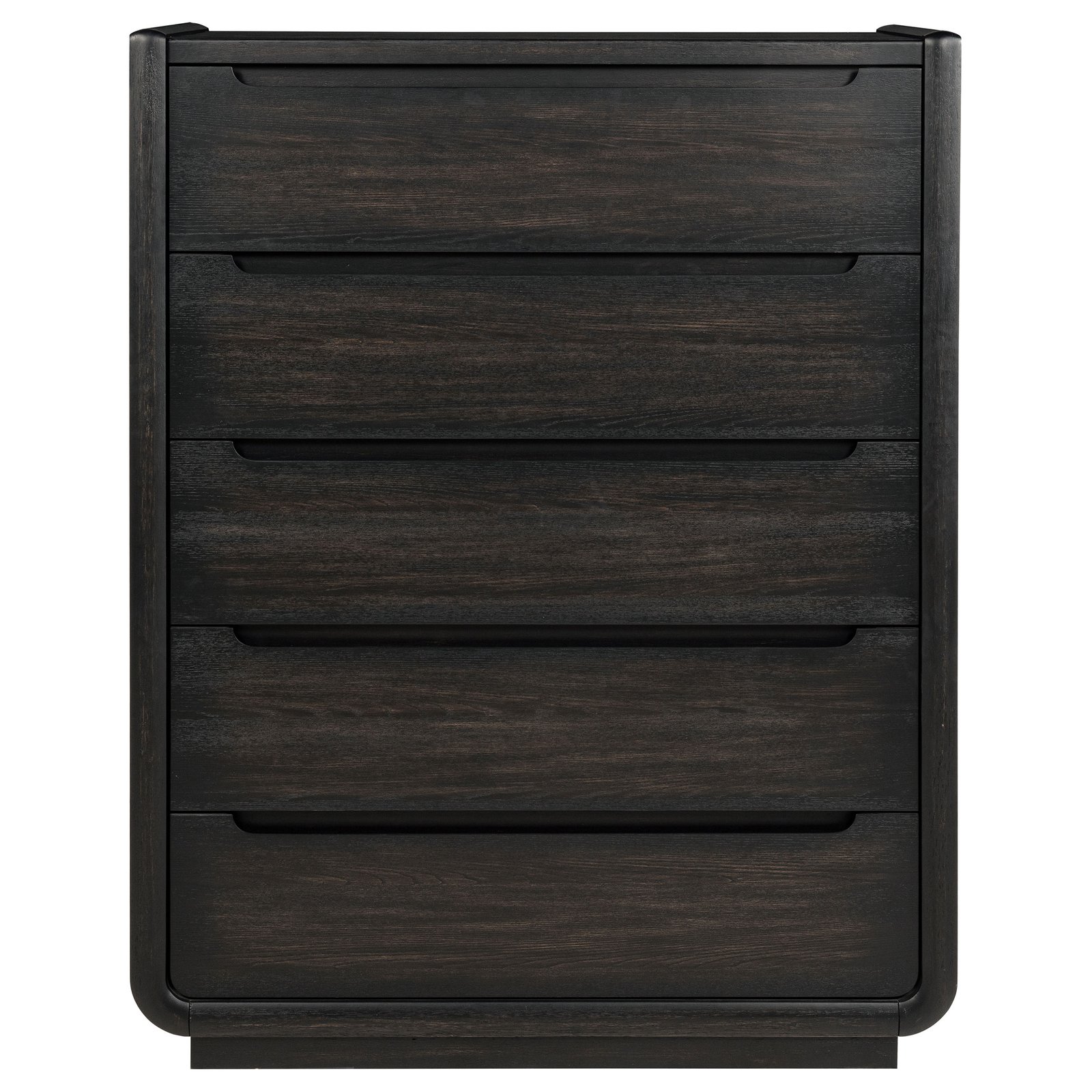 Balance and beauty meet in this five-drawer chest, where softened curves and a deep burnished black finish bring quiet depth to the room. Recessed pulls and rounded corners echo a modern sensibility, while black felt-lined top drawers protect what matters most. Designed with English dovetail joinery, soft-closing glides, and a fully enclosed dust panel, this tall silhouette blends sculptural refinement with everyday function.