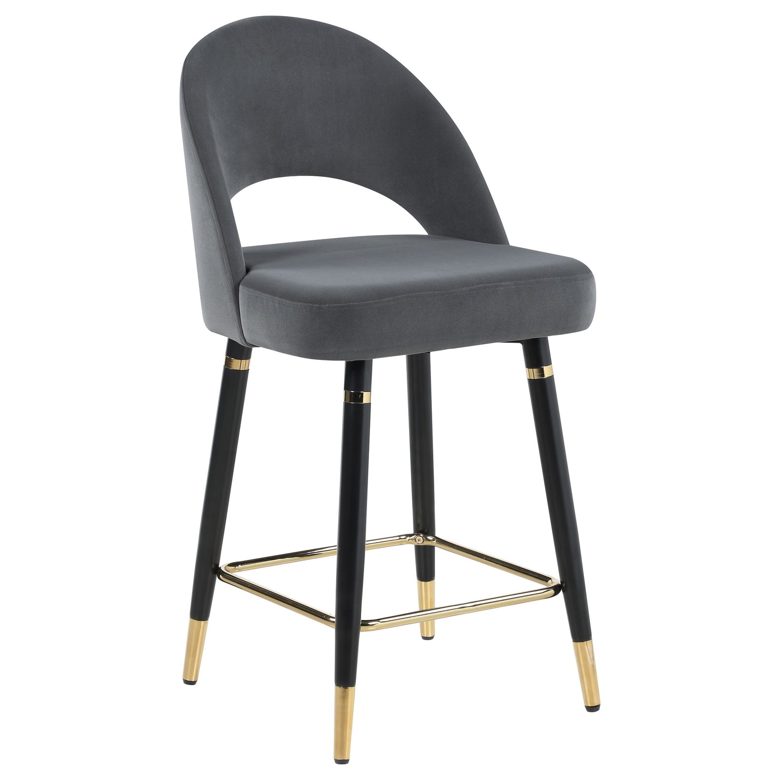 This set of two counter height stools features an elegant bucket style seat that lends a retro-inspired Mid Century modern look. Each stool offers long-lasting, supportive seats for each guest, wrapped in faux leather upholstery that complements numerous color palettes and adds a bold statement piece. Flared, tapered legs further lend to the vintage flair. Gold capped feet and a supportive foot brace offer a dramatic, regal Hollywood glam touch. Pull these stools up to a spacious entertainment room bar for cocktails.