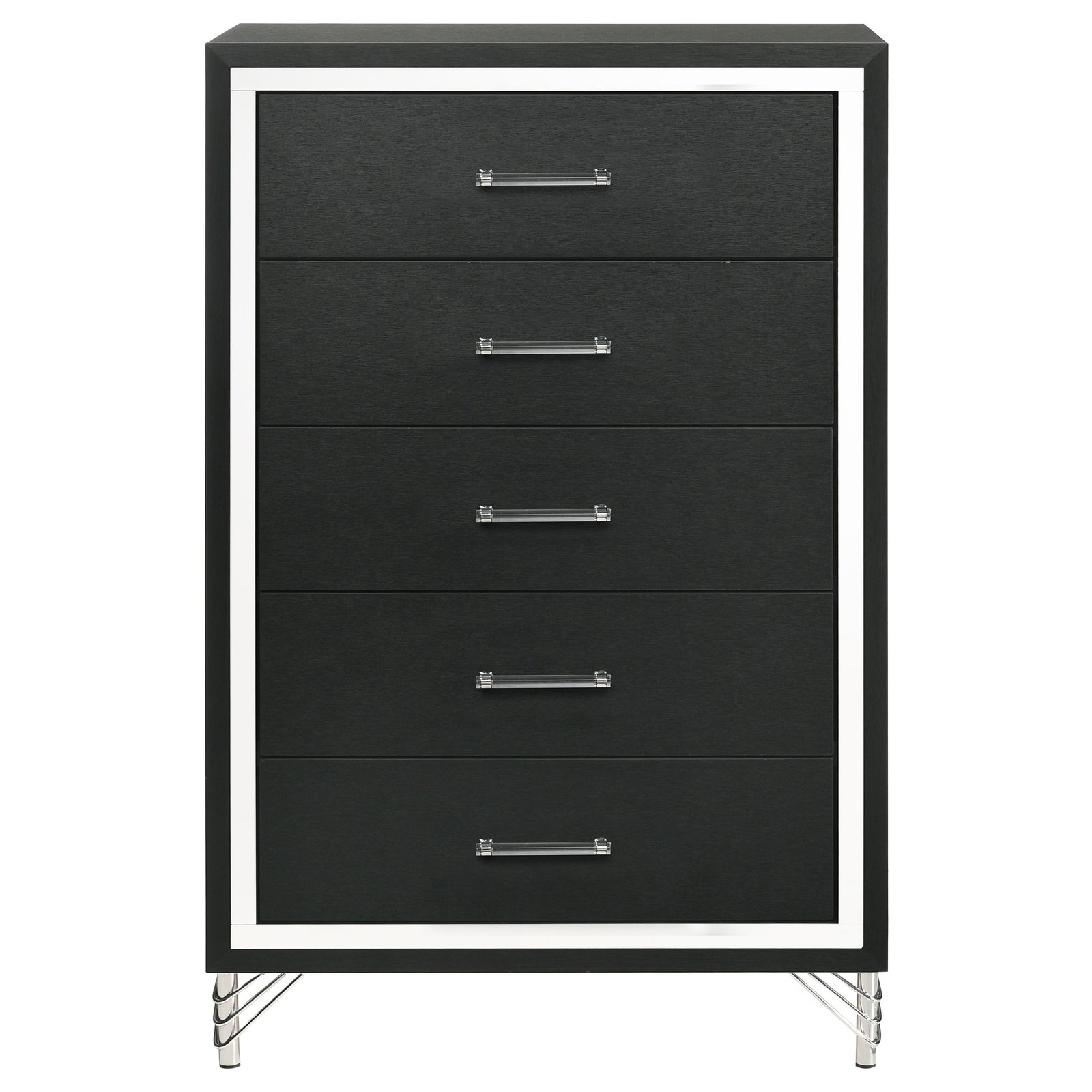 Inspired vintage touches create a refined sensibility for a modern five-drawer chest. Its tall, compact profile is ideal for a dressing area, offering plenty of storage with five roomy drawers that host everything from clothing and accessories to linens and other personal effects. The chest shows off a bold black finish, complete with gleaming chrome trim that adds coolness and elegance. Its long bar drawer pulls add character, while hair pin inspired legs bring retro glamour and sophistication. Add decor to the top for a personal touch in your bedroom.