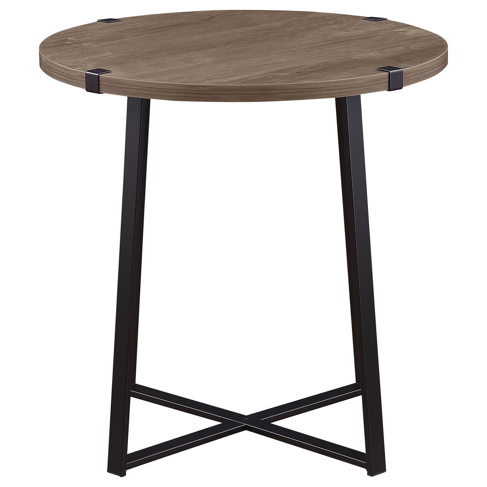 Soft brown on the tabletop creates a stylish sense of contrast for this modern round end table. Showing off a timeless silhouette, the table stands on a pair of intersecting U-shaped supports, each in a black finish over metal construction. Bracket details connect the top and base, adding industrial flair to a contemporary color palette. The tabletop offers a melamine veneer, increasing resistance to scratches and dents, perfect for high-traffic spaces like family and living rooms. Choose the prefect lamp or vase to complete the look.