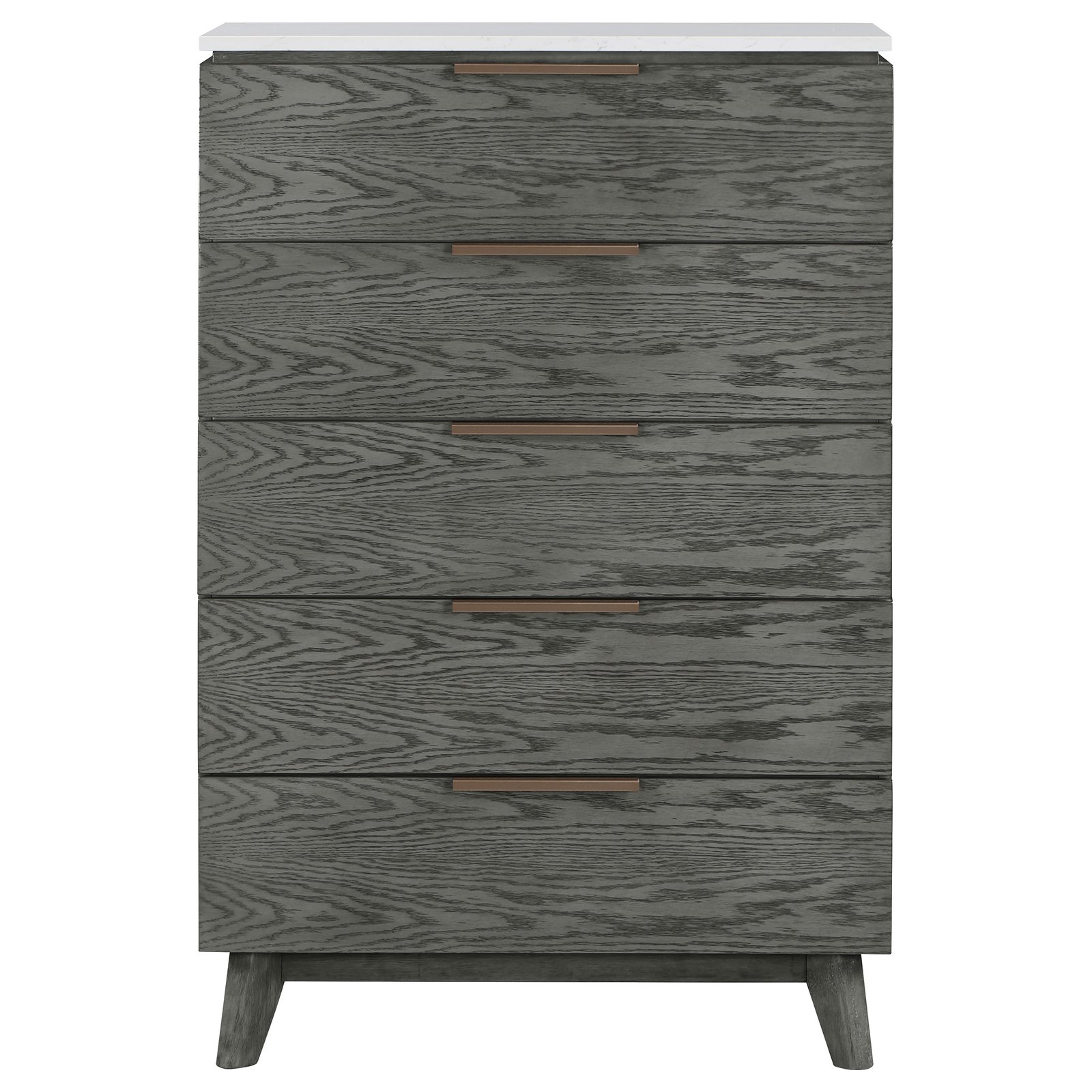 Luxurious white marble is a beautiful, organic complement to this modern five-drawer chest. Perfect for a stylish bedroom, the chest offers lovely wood grain details highlighted with an on-trend gray finish. The marble on top lightens the look while delivering lush elegance and providing a solid surface for decor and personal touches in your bedroom. Each drawer front is augmented with a copper finish bar pull, and splayed legs add richness and character to the overall look. Five drawers offer ample storage, with felt linin in the top drawer that makes it a perfect spot for delicates.
