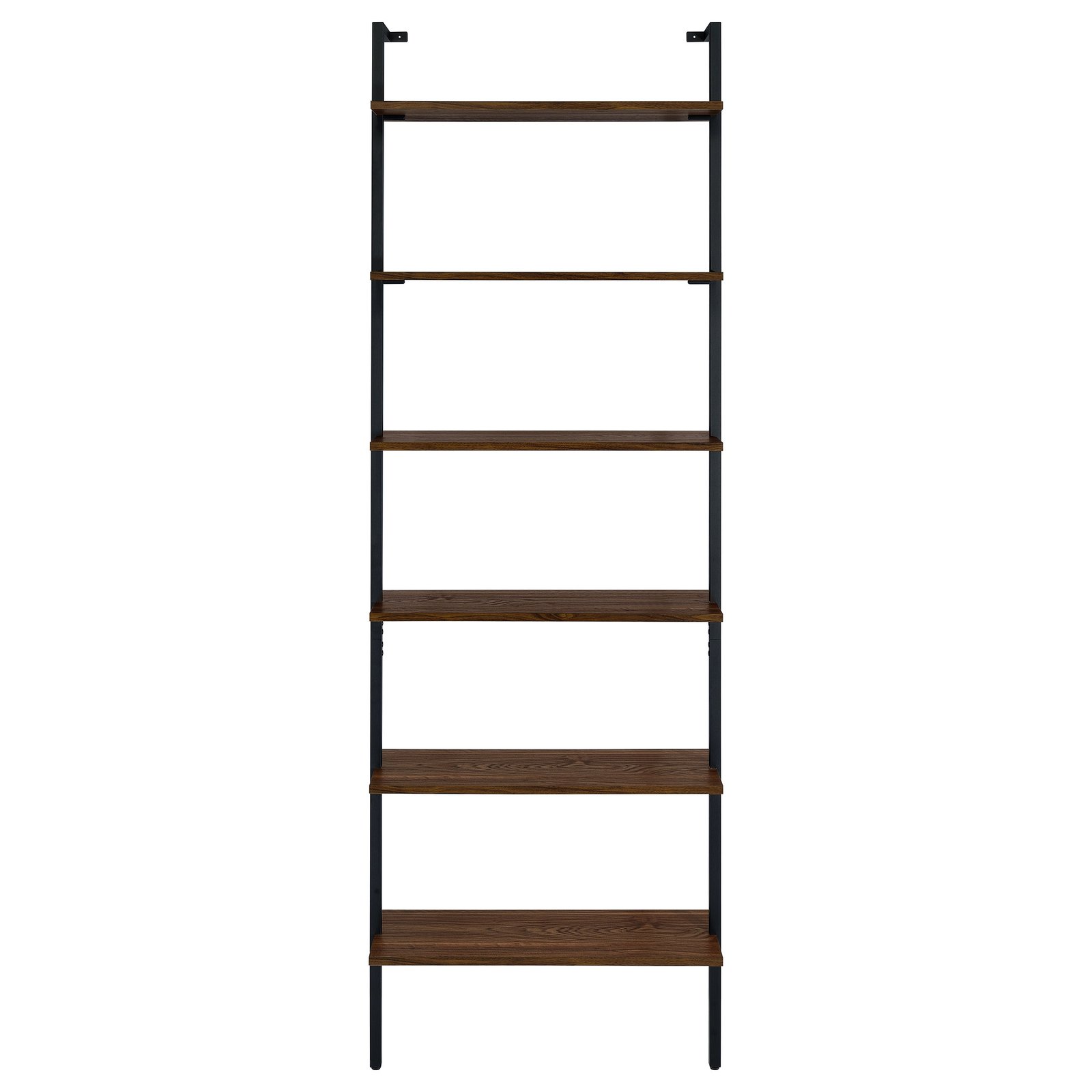 Curate your space to achieve a refined look and feel with this modern wall bookcase. Its elegant simplicity of silhouette brings light, airy ambiance in any space, maximizing space utilization without overwhelming. It features six open shelves in a walnut finish, each set within a black finish metal frame. The clean, chic lines of the frame attach to the wall at the top and drop to the floor, creating stability and minimalist appeal. Add a pair flanking your television for storage, or create a decorative vignette in a living or dining room.
