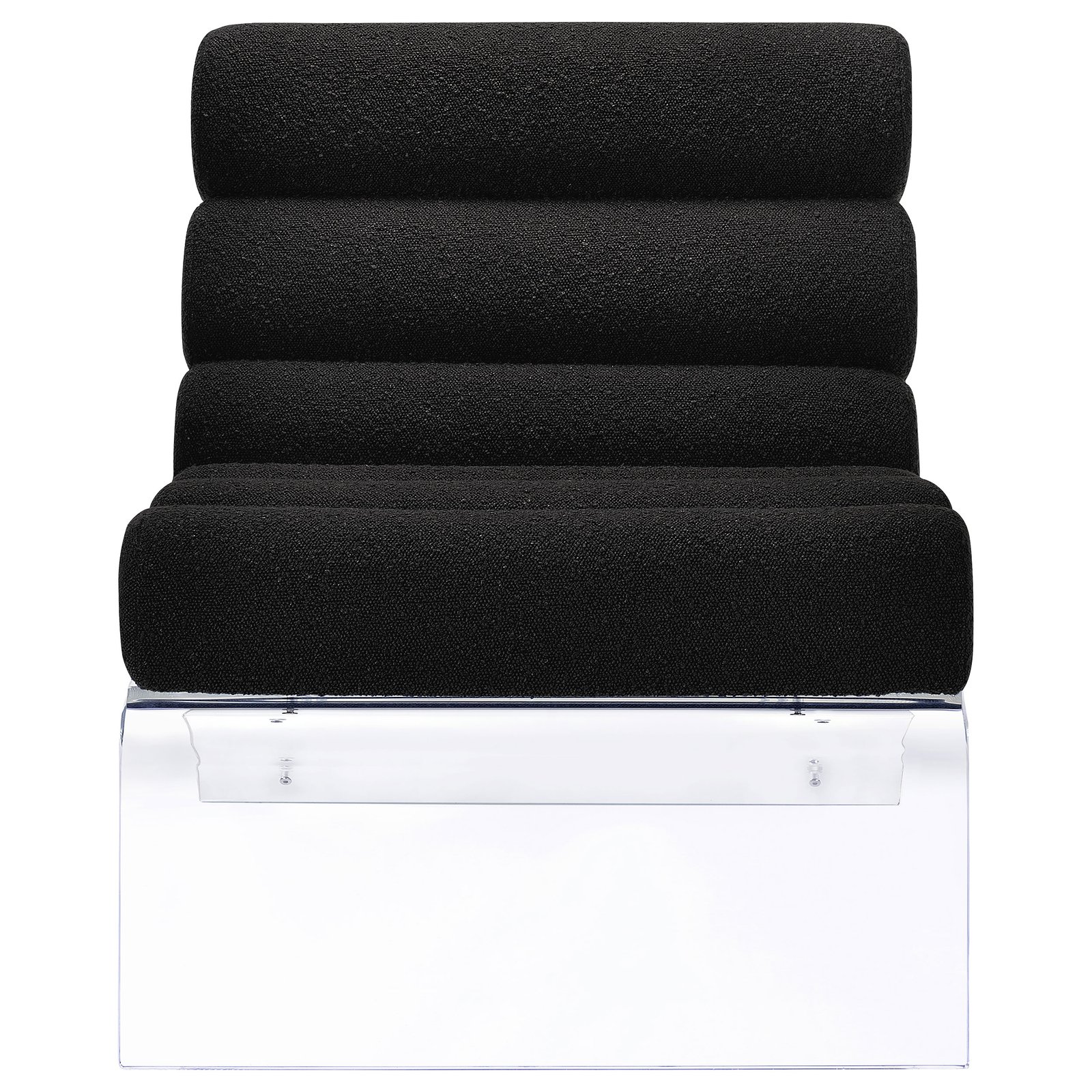 Discover a fusion of contemporary design and luxurious comfort in this accent lounge chair, where horizontal channeling meets the rich texture of bouclé fabric. The thick, clear acrylic frame, crafted with the highest quality, surrounds the upholstered elegance, creating a sophisticated floating effect. Each line of channeling invites you to experience comfort tailored for relaxation, while the chair’s transparency blends with its environment, offering a seamless flow of style. This isn’t merely furniture; it’s a centerpiece that commands attention without overshadowing the room. Revel in the blend of plush comfort and flawless clarity that this chair brings to your cherished living space.
