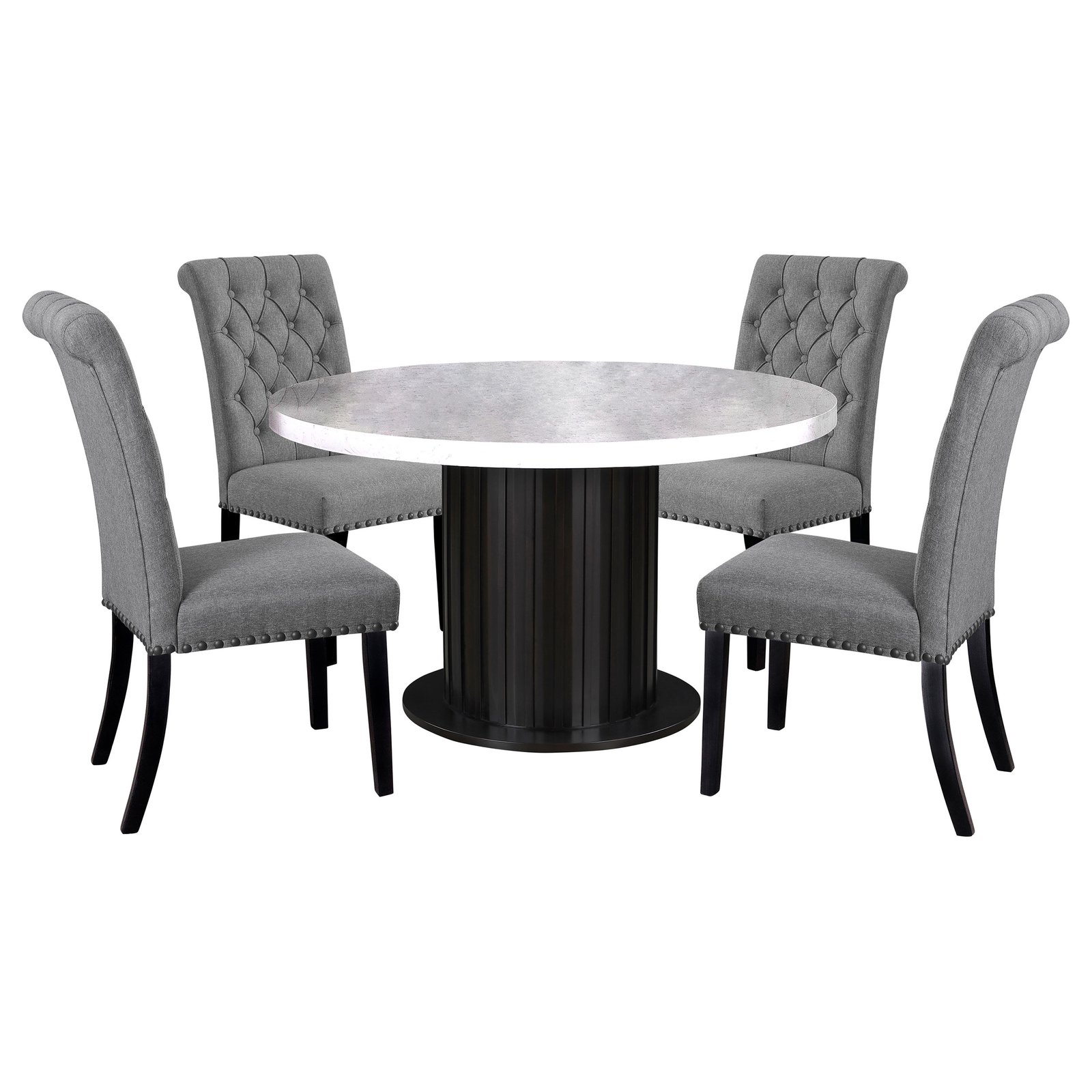 This elegant, contemporary, five-piece dining set completes formal dining experiences with a round, white, cultured marble, and rustic espresso pedestal table and four upholstered parson style side chairs. Charming details like button-tufted rolled backrests, bold nailhead trim, and flared legs lend a classical approach with modern elements.