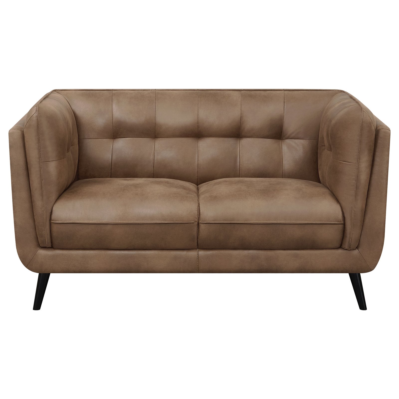 Complete your contemporary living room setup with this mid-century modern shelter style loveseat, designed as an updated take on the classic Chesterfield style silhouette including grid tufted seats and backs along with welt trim details. Upholstered in a soft and smooth brown microfiber leather, this retro-inspired contemporary loveseat sits on dark brown tapered wood legs that give an industrial, modern feel and vintage expression to your seating area.