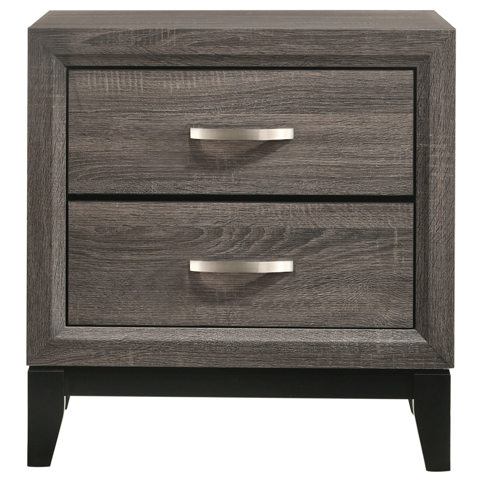 A contemporary take on mid-century modern design, the color blocking from this grey two-drawer nightstand sets it apart from the rest. Constructed of oak, the body showcases a light, exposed wood grain that oozes sophistication. Tapered legs in a black finish offer a modern feel, adding visual intrigue with neutral hues. Bright and metallic, light drawer pulls curve off the flat drawer fronts in a half moon shape. Complete a retro motif, or add fun flair to an up-to-date scheme.